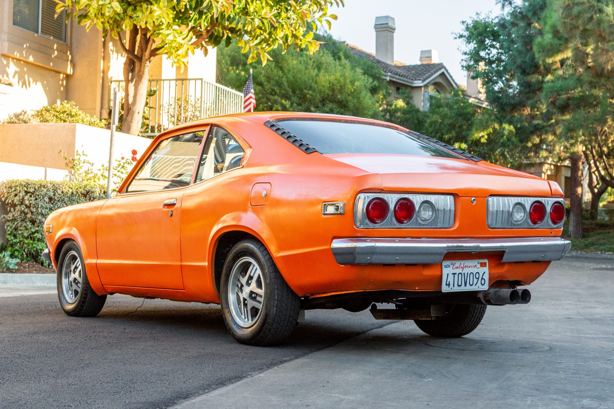 13″ alloy wheels sourced from an FB-generation RX-7 are mounted with 185/70 GT Radial Champiro 70 tires. The seller states the front suspension was lowered by a previous owner by cutting the front springs and the rear suspension has also been modified, and the brake pedal is soft when applied as the brake lines are in need of replacement.