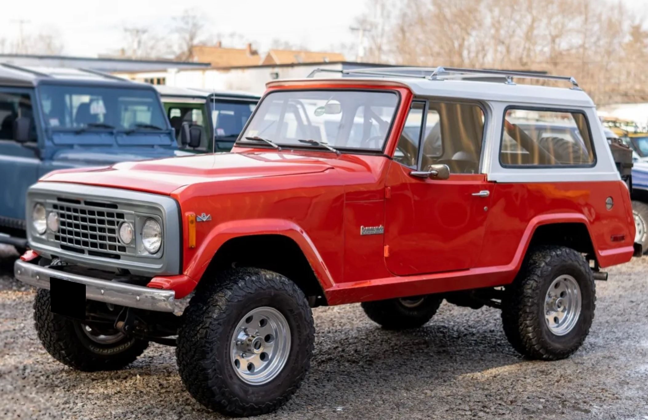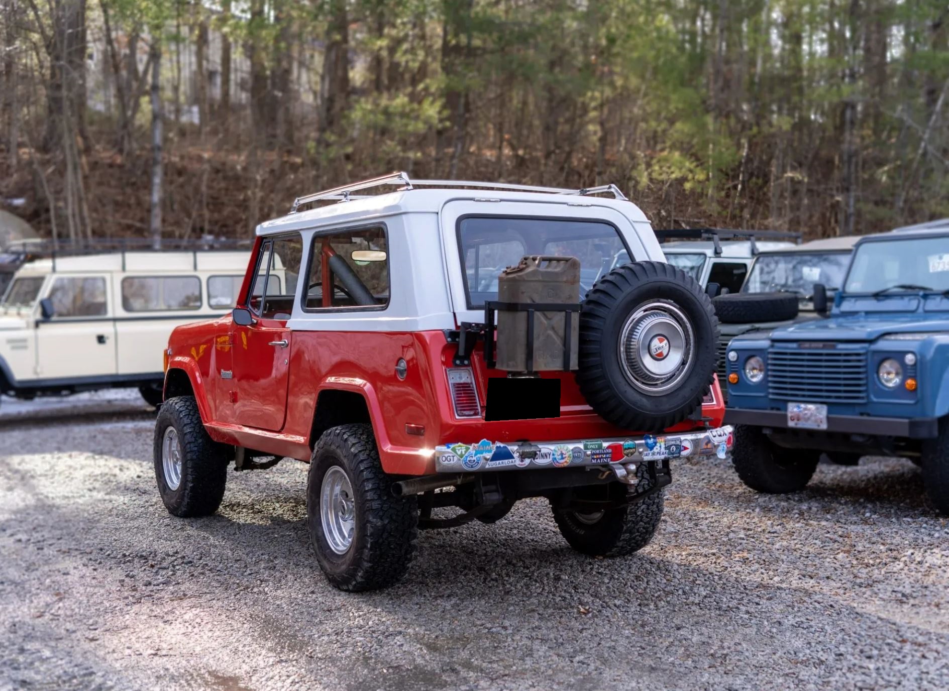 Eight-hole 15″ American Racing wheels are wrapped in 32×11.5″ BFGoodrich All-Terrain T/A tires. Braking is handled by drums at all four corners, and an aftermarket suspension lift kit has been fitted according to the selling dealer. The spare wheel wears a Jeep-branded cover and is wrapped in a 7.00-15″ Firestone tire. The front wheel cylinders are leaking, and the braking system will need service before driving. The selling dealer also states that the steering shaft, front axle u-joints, and front driveshaft slip joint are worn.