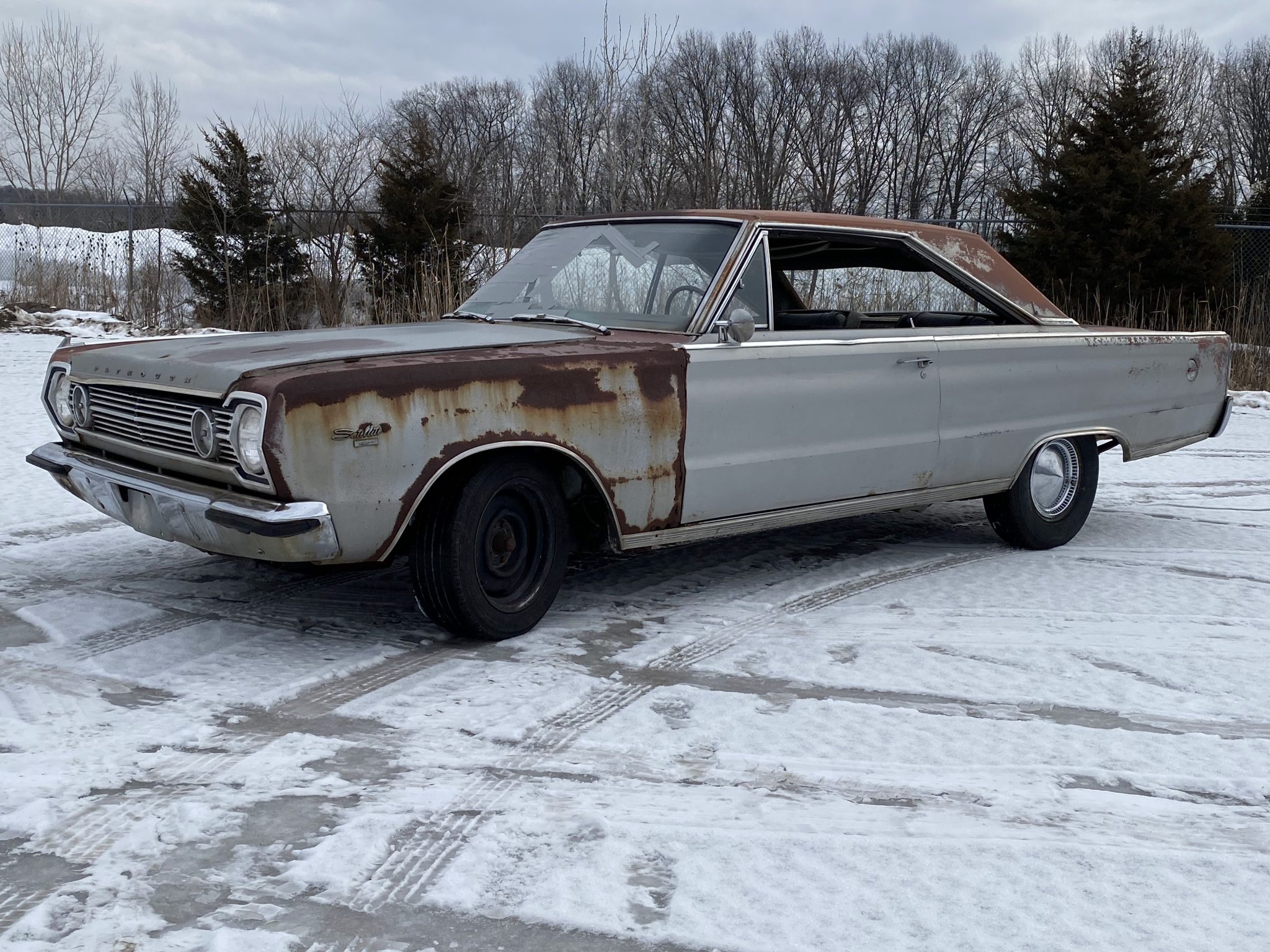 The car wears three steel wheels and a five-spoke wheel, all of which are mounted with older mismatched tires. A set of chrome hubcaps is included in the sale. The car is fitted with four-wheel drum brakes.