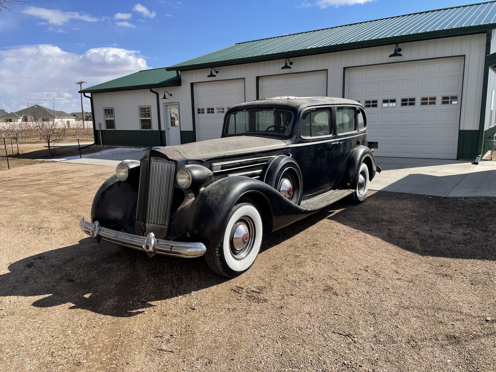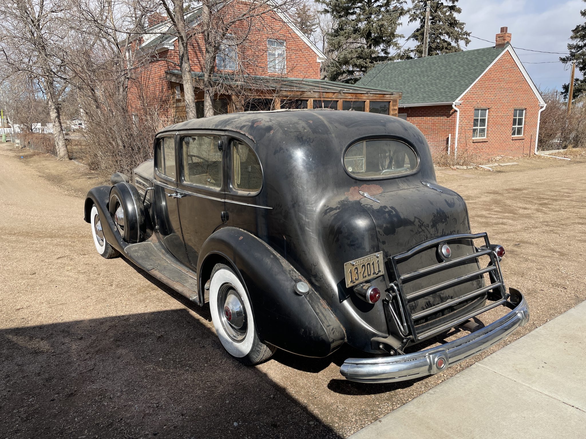 The black-painted steel wheels wear chrome hubcaps and trim rings, and they are mounted with older 7.50–16 Hercules Express bias-ply whitewall tires. Matching spare wheels are mounted in the front fenders in body-color covers. An independent front suspension and hydraulic drum brakes at all four corners were standard features for Fifteenth Series models.