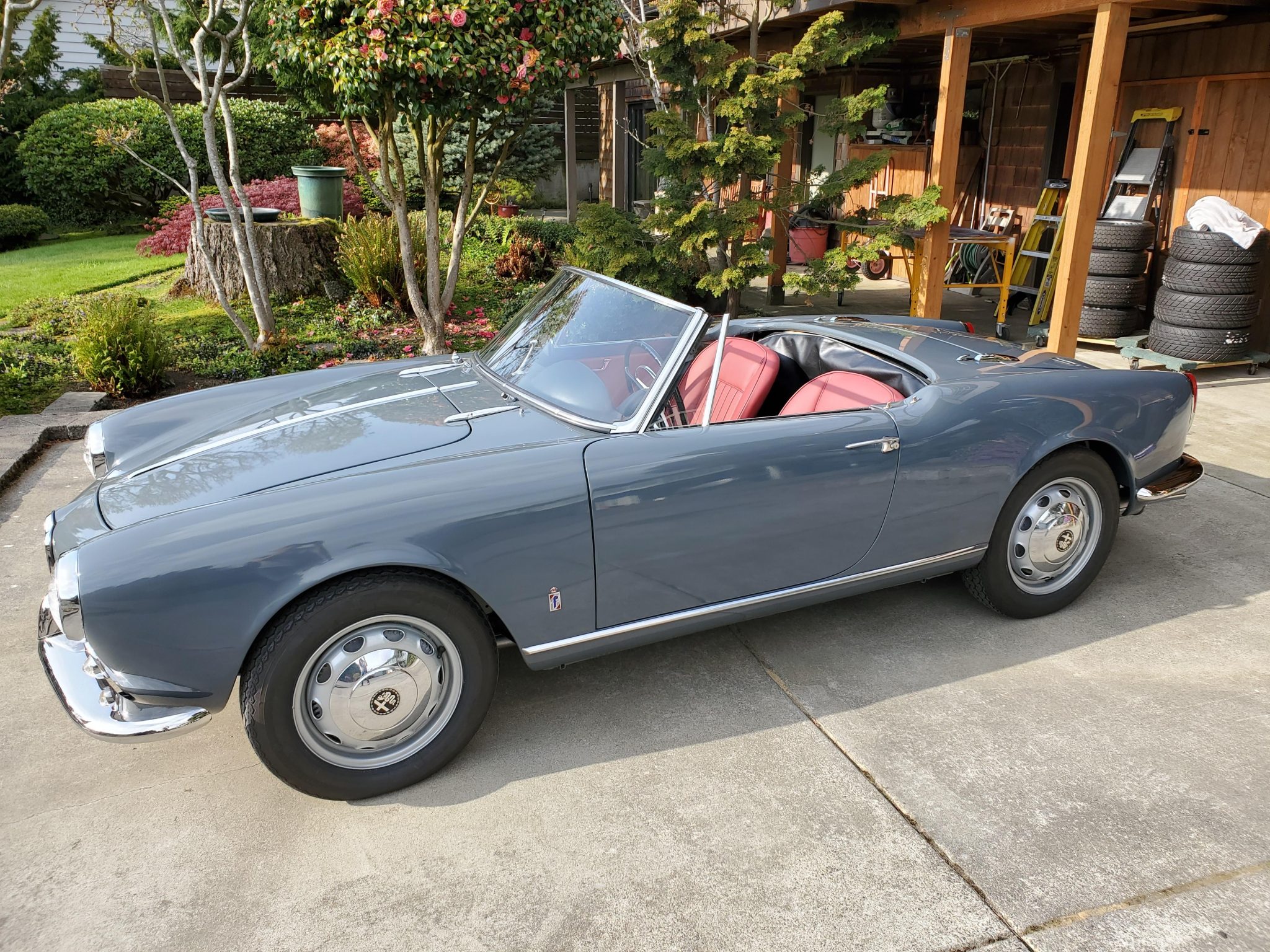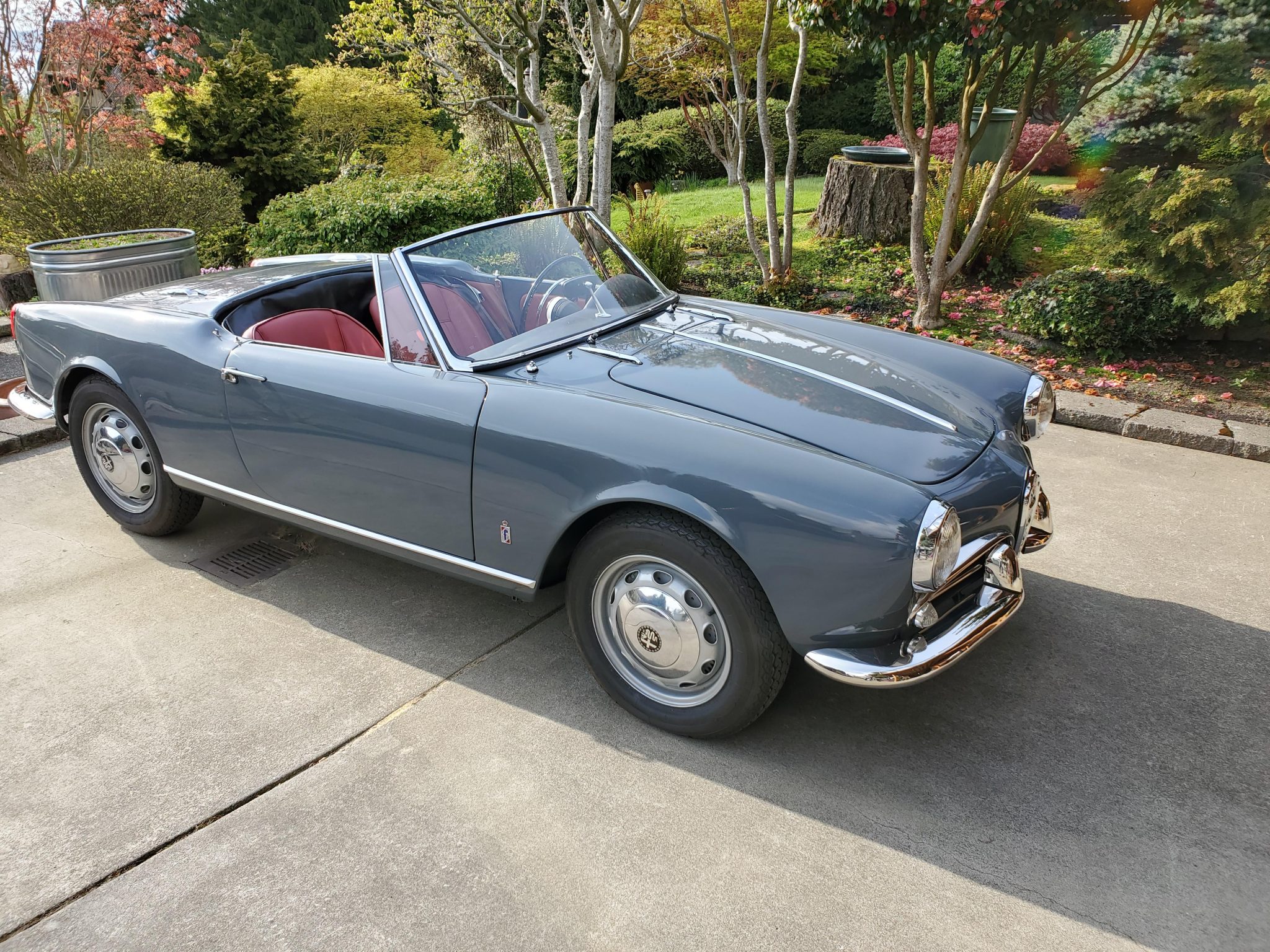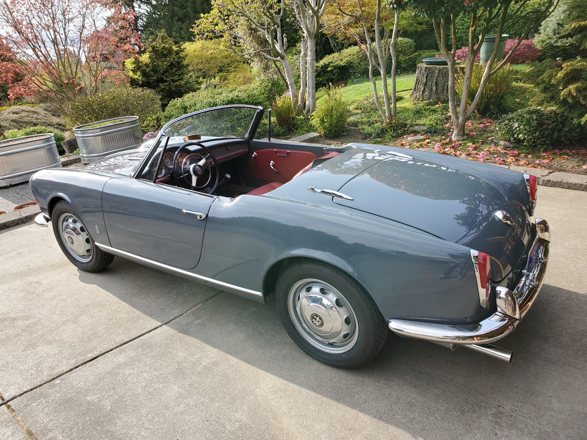 Ventilated 15″ steel wheels wear Alfa Romeo–branded hubcaps and are mounted with 155-series Vredestein Sprint Classic tires. Drum brakes are utilized at each corner. The brake lines have been replaced, and the suspension is said to have been rebuilt with replacement ball joints and springs. The Koni shocks may need to be replaced, according to the seller.