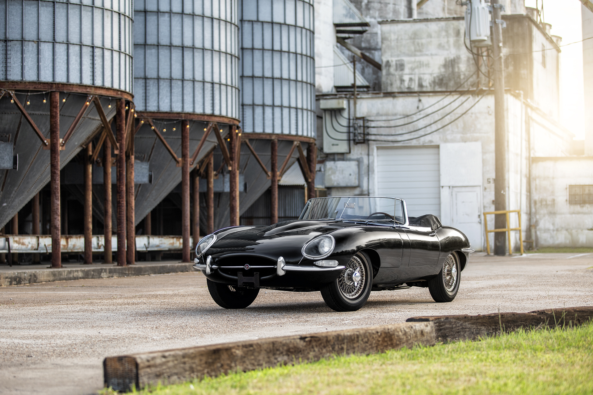 Silver 15″ wire wheels are secured via two-eared knock-off spinners and are mounted with 6.40-15″ Dunlop Road Speed RS5 whitewall tires. The wheels exhibit corrosion, and cracking is present on the tires. The car is equipped with four-wheel disc brakes, and the rears are mounted inboard.
