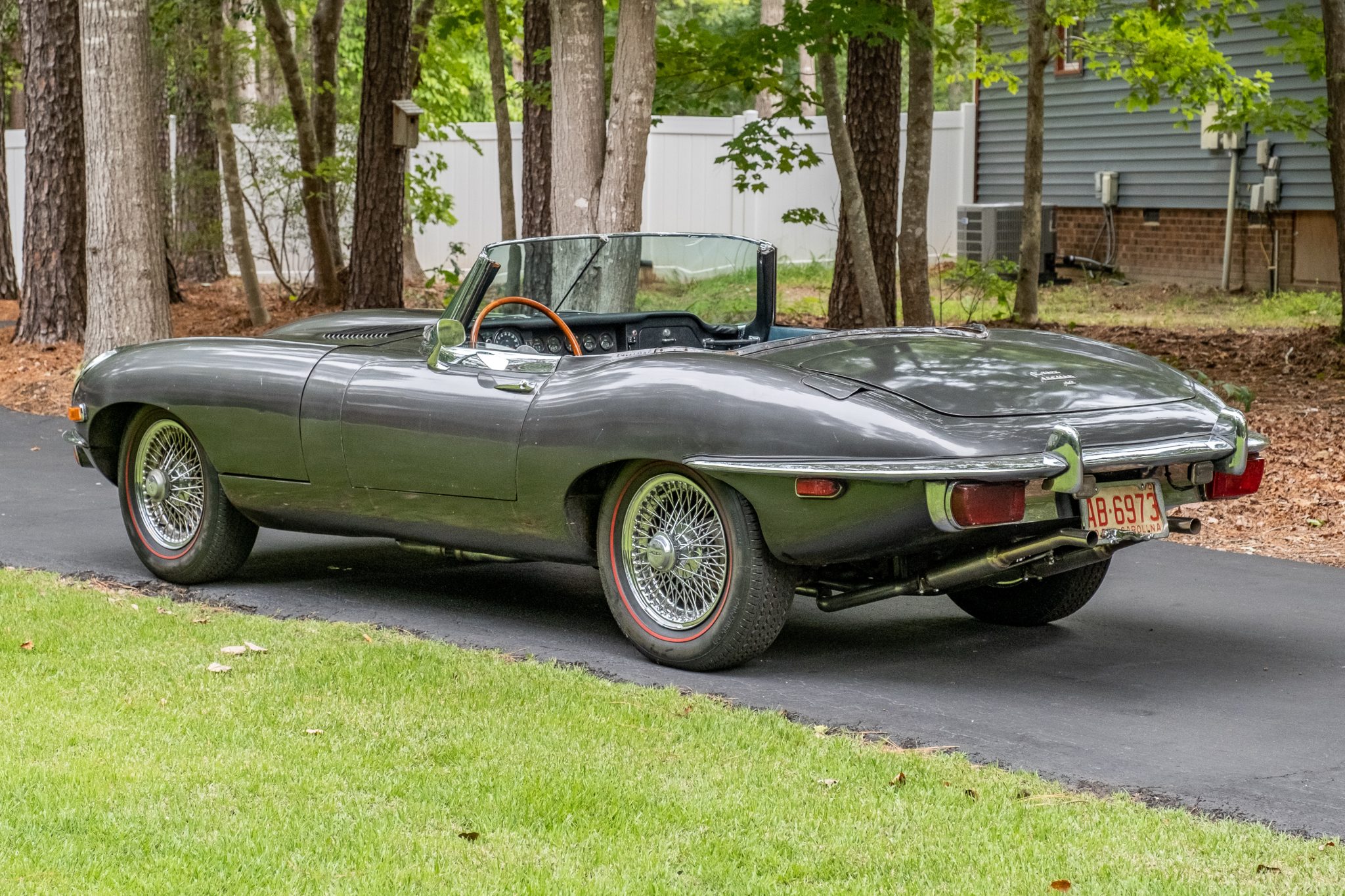 Chrome 15″ wire-spoke wheels secured with branded continental knock-off nuts are wrapped in Diamond Back Auburn Premium redline tires, and a matching spare stows beneath the floor in the trunk. Braking is provided by four-wheel discs for which the master cylinder, servo, calipers, discs, pads, soft lines, and fluid reservoir bottles have been replaced. The rear suspension trailing arms and bushings have been replaced. The car was ordered with optional power steering, though the seller notes that the pump leaks and has been bypassed using a custom hose.