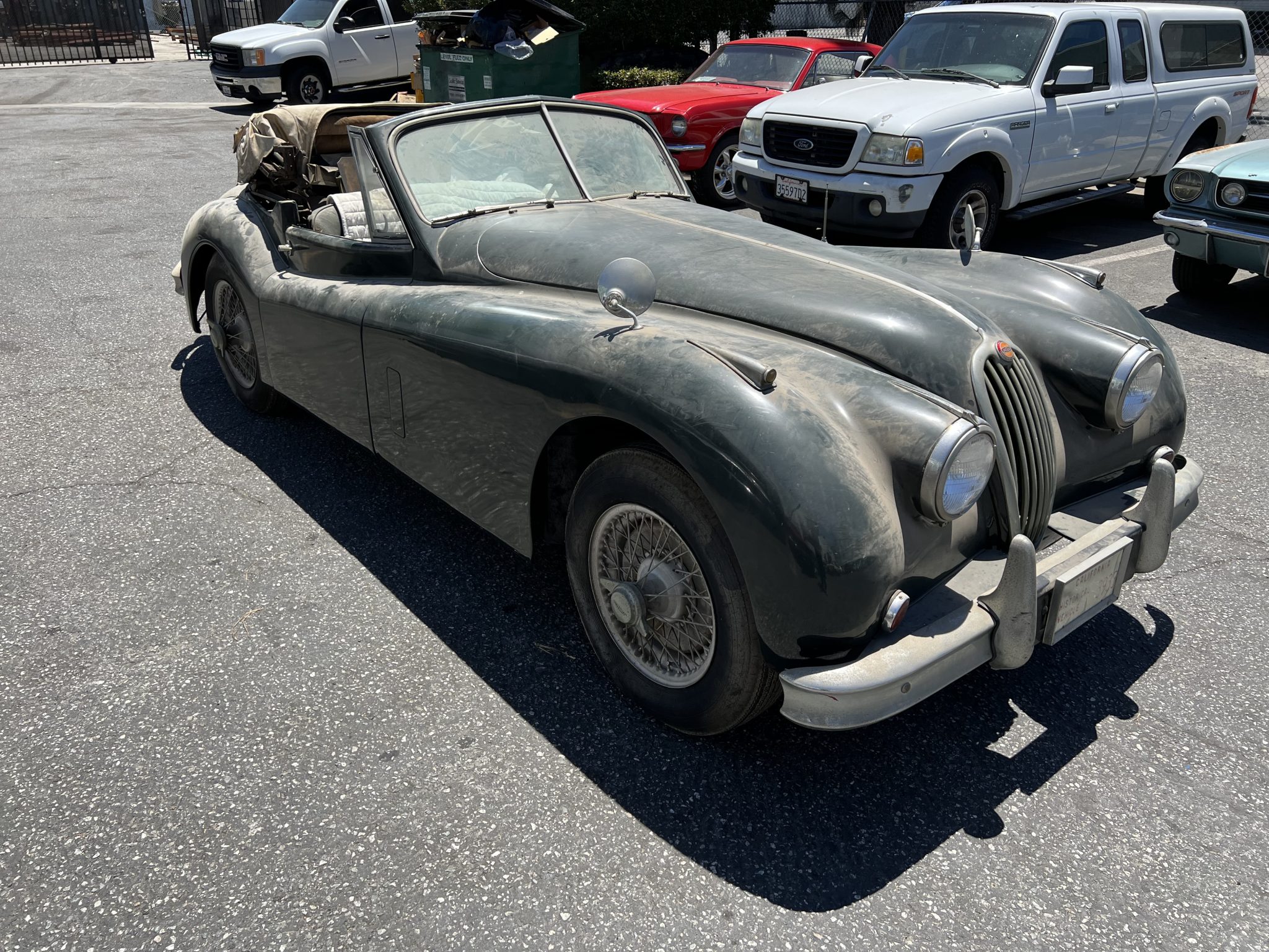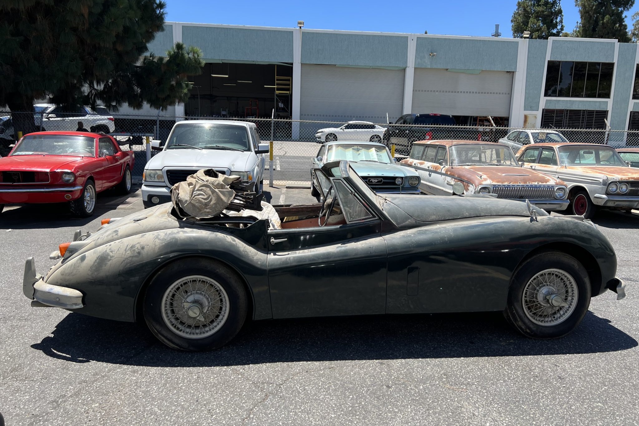 The 16” wire wheels are secured by two-eared knock-off spinners and mounted with older Dunlop tires that have cracked sidewalls. MC-specification cars were equipped from the factory with heavier torsion bars than the standard 140, and the car is equipped with drum brakes at all four corners.