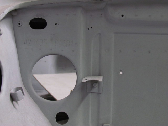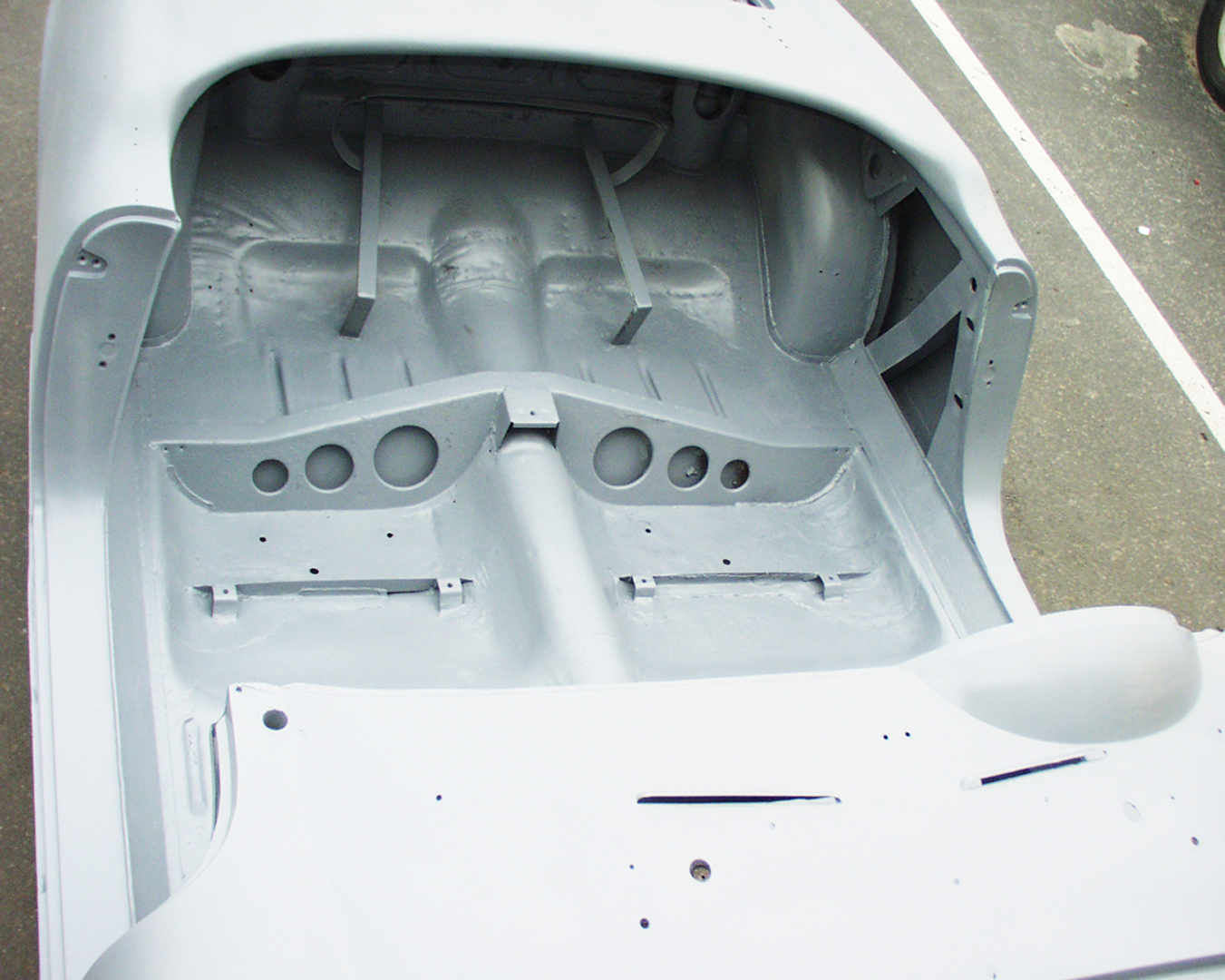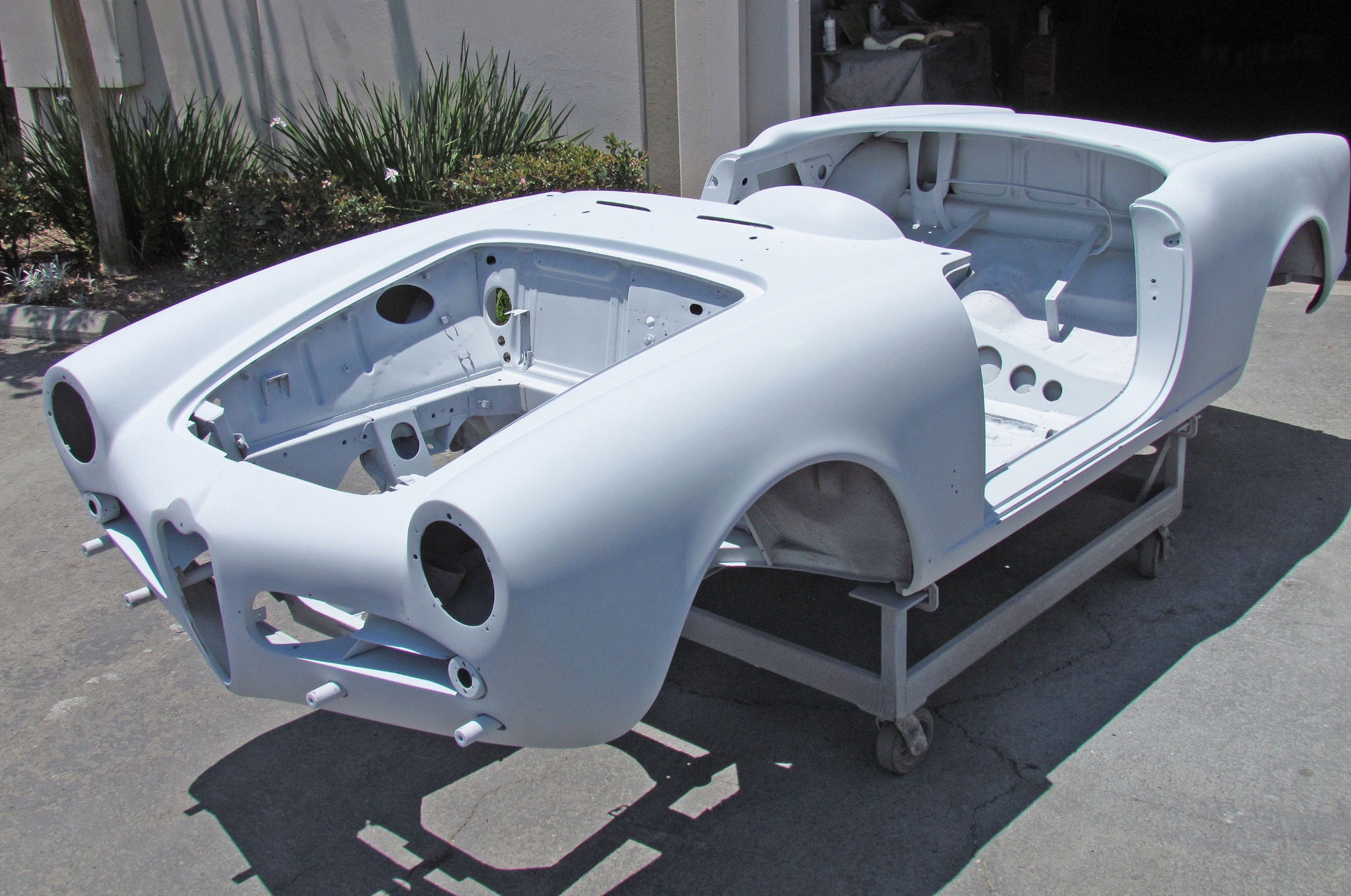 Much of the brightwork has been replated, including the bumpers, stamped front grille, eyebrows, headlight rings, and split oval tail lamps. Items known to be missing include the windshield glass and a few chrome fasteners, along with one door latch, sill plate, and door cup. An uncovered soft top frame accompanies the car.