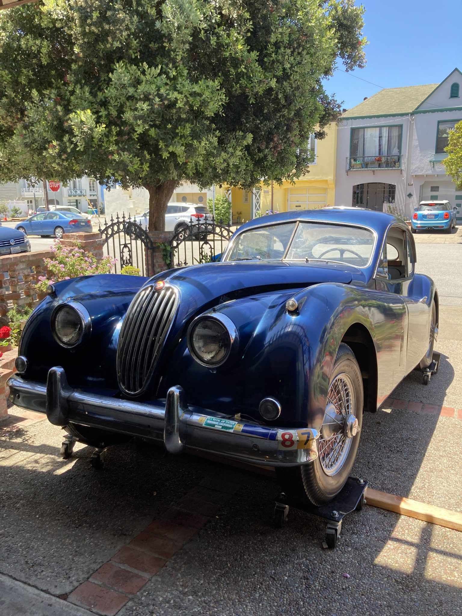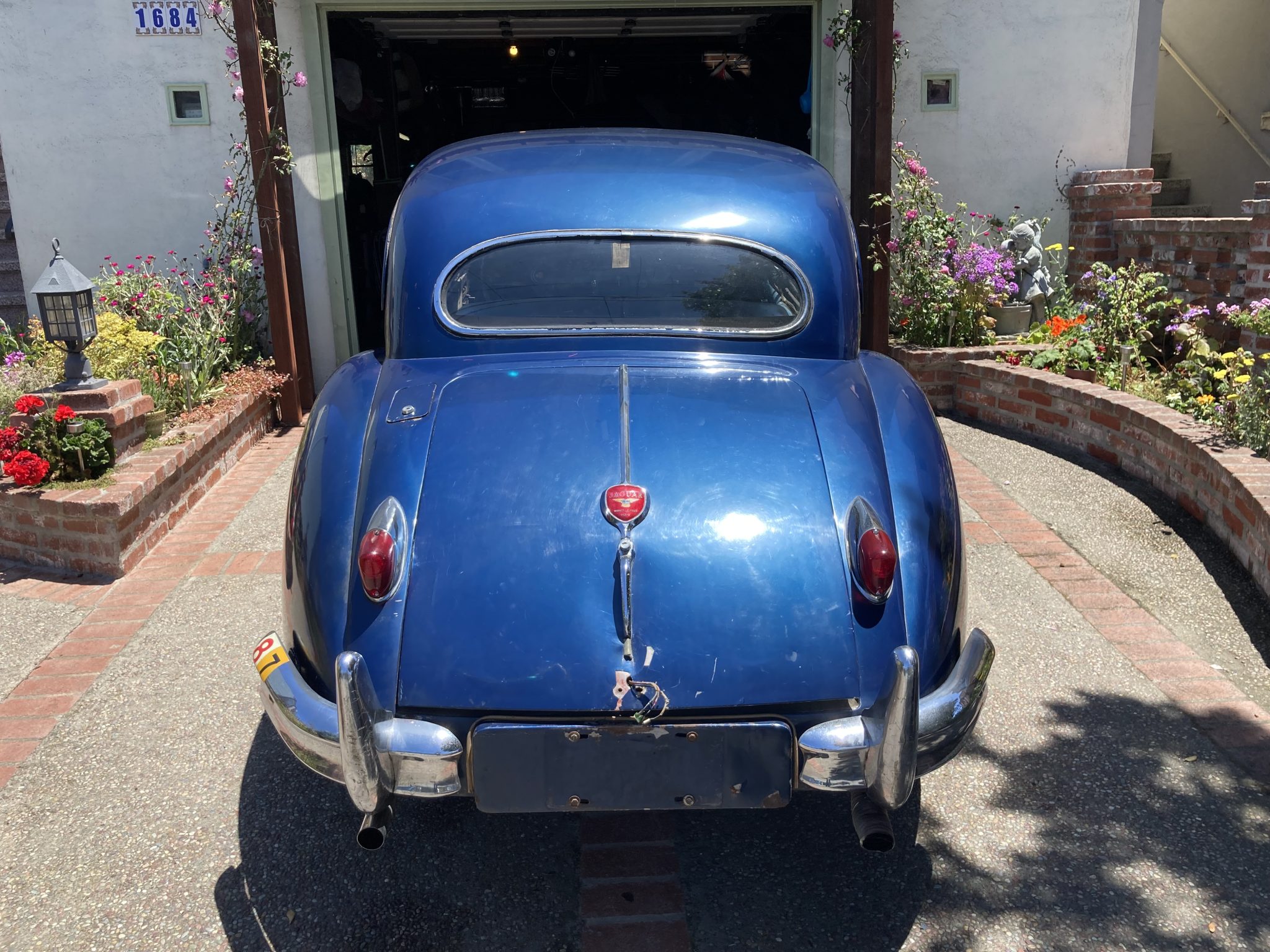 Silver 16″ knock-off wire wheels wear two-ear spinners, and a matching spare is included in the sale. The car is equipped with four-wheel drum brakes.