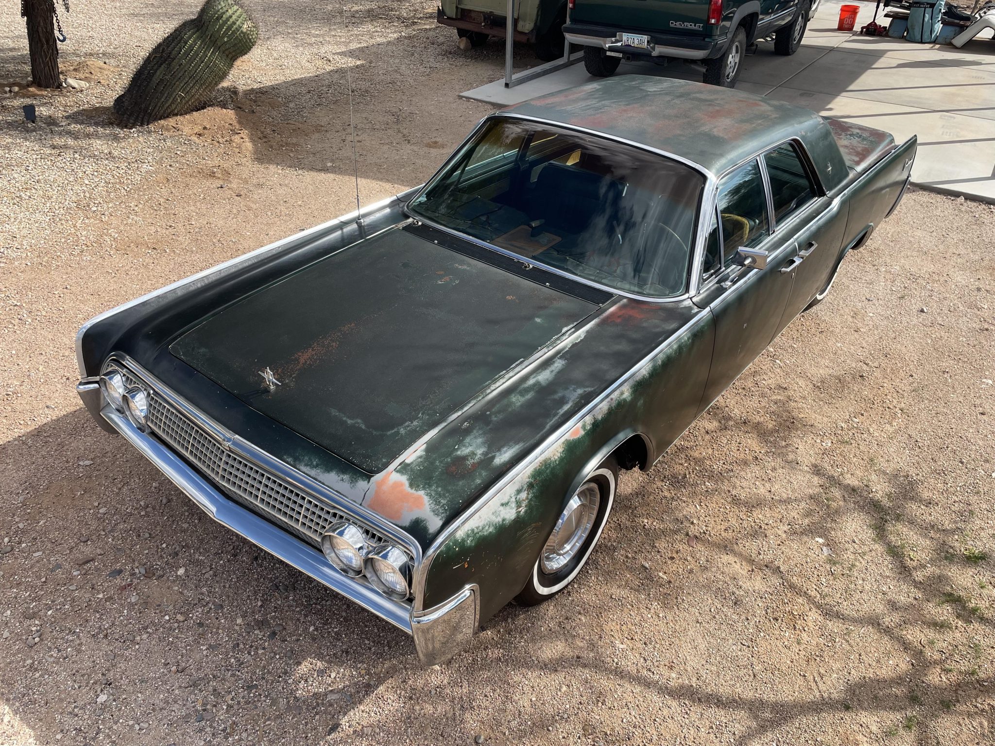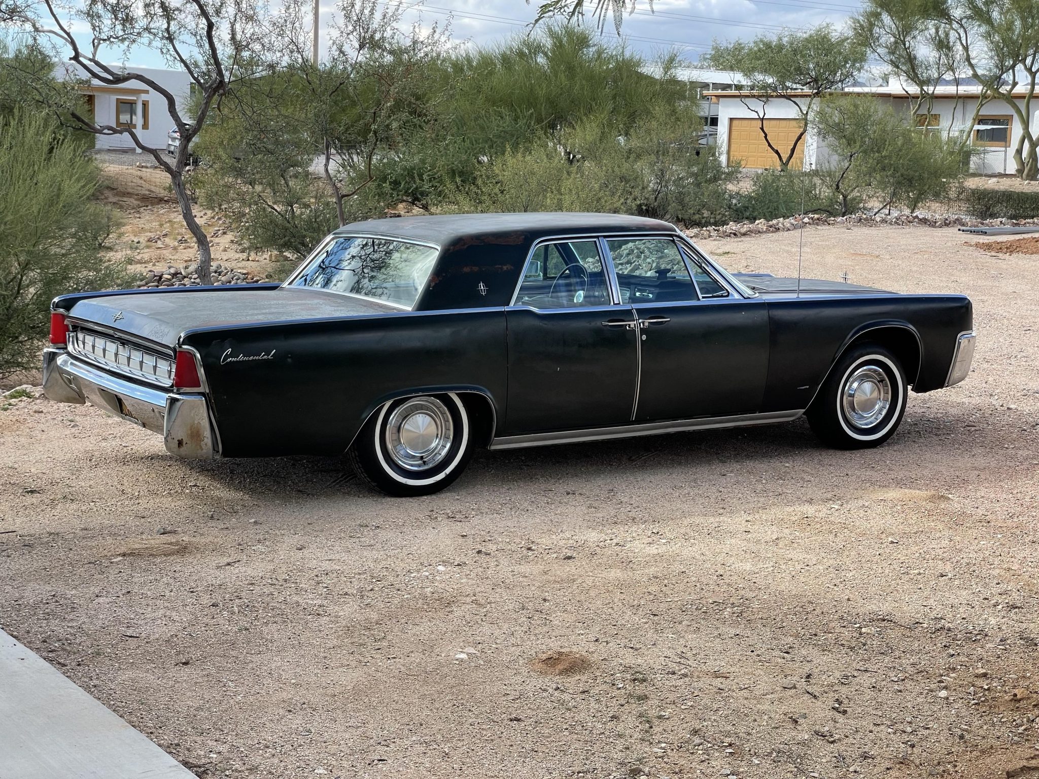 The 14″ steel wheels feature later-model replacement Lincoln-branded hubcaps and are mounted with older whitewall tires. The car is equipped with power-assisted steering and brake components.