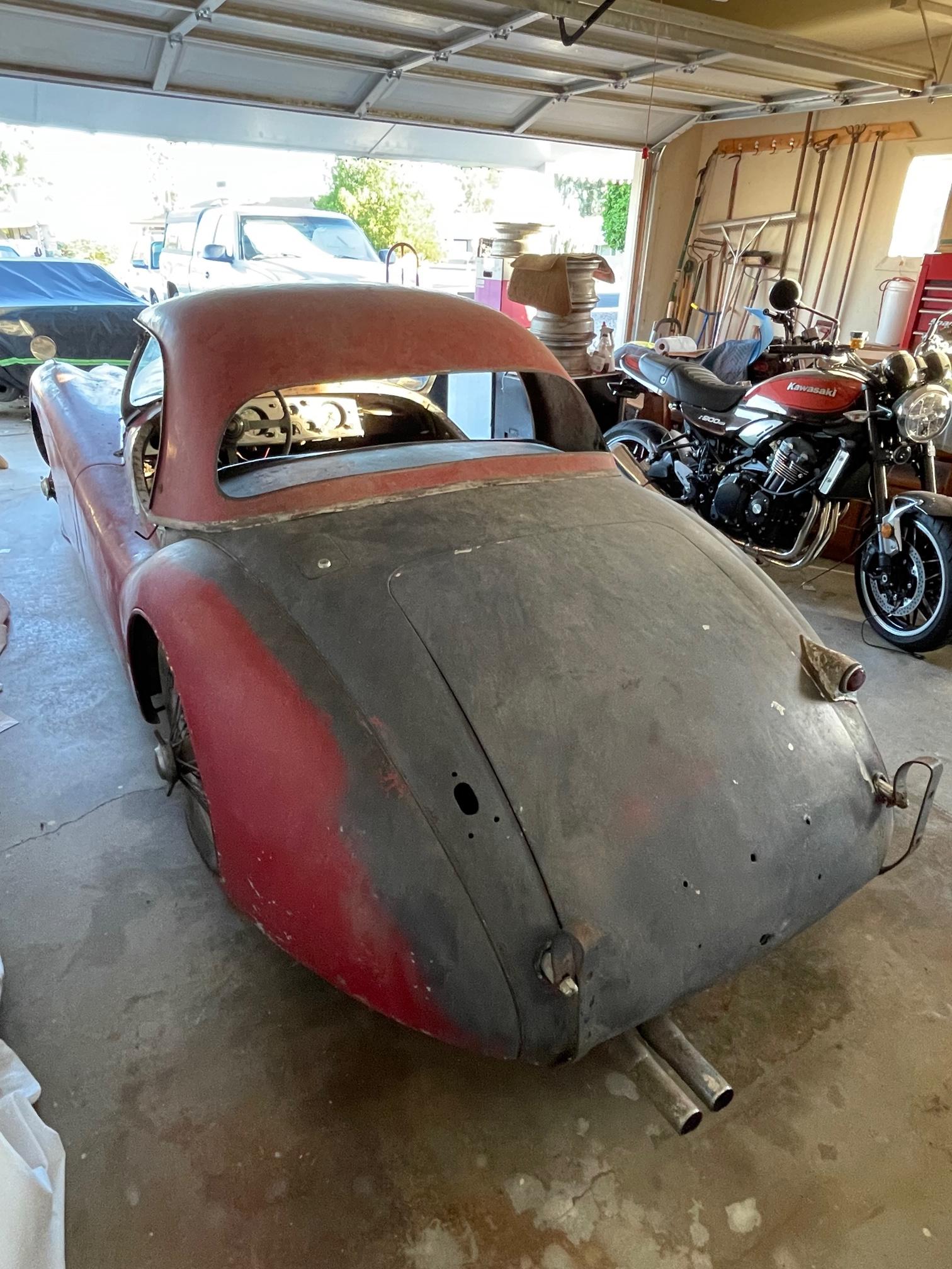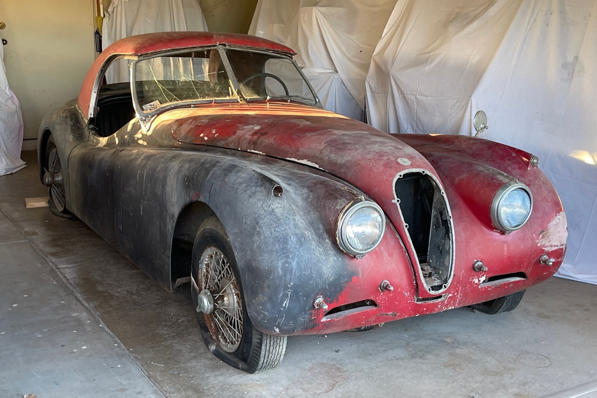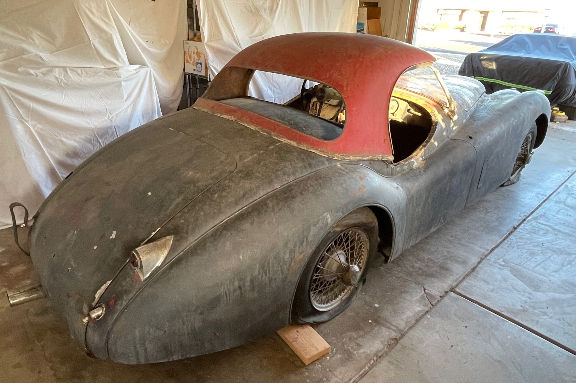 The knock-off wire wheels show corrosion and are mounted with older tires that require replacement. Two spare wheels are included in the sale, along with four removed brake drums and a brake master cylinder.
