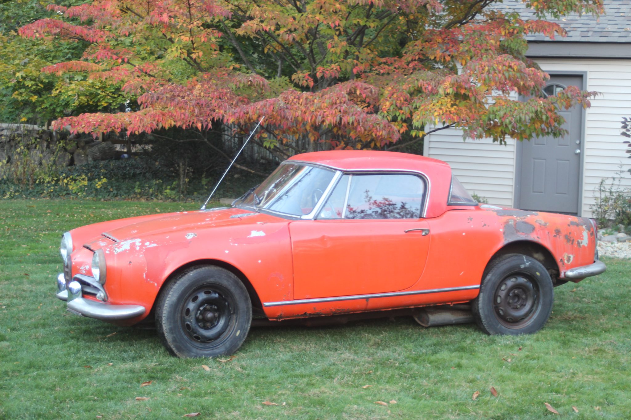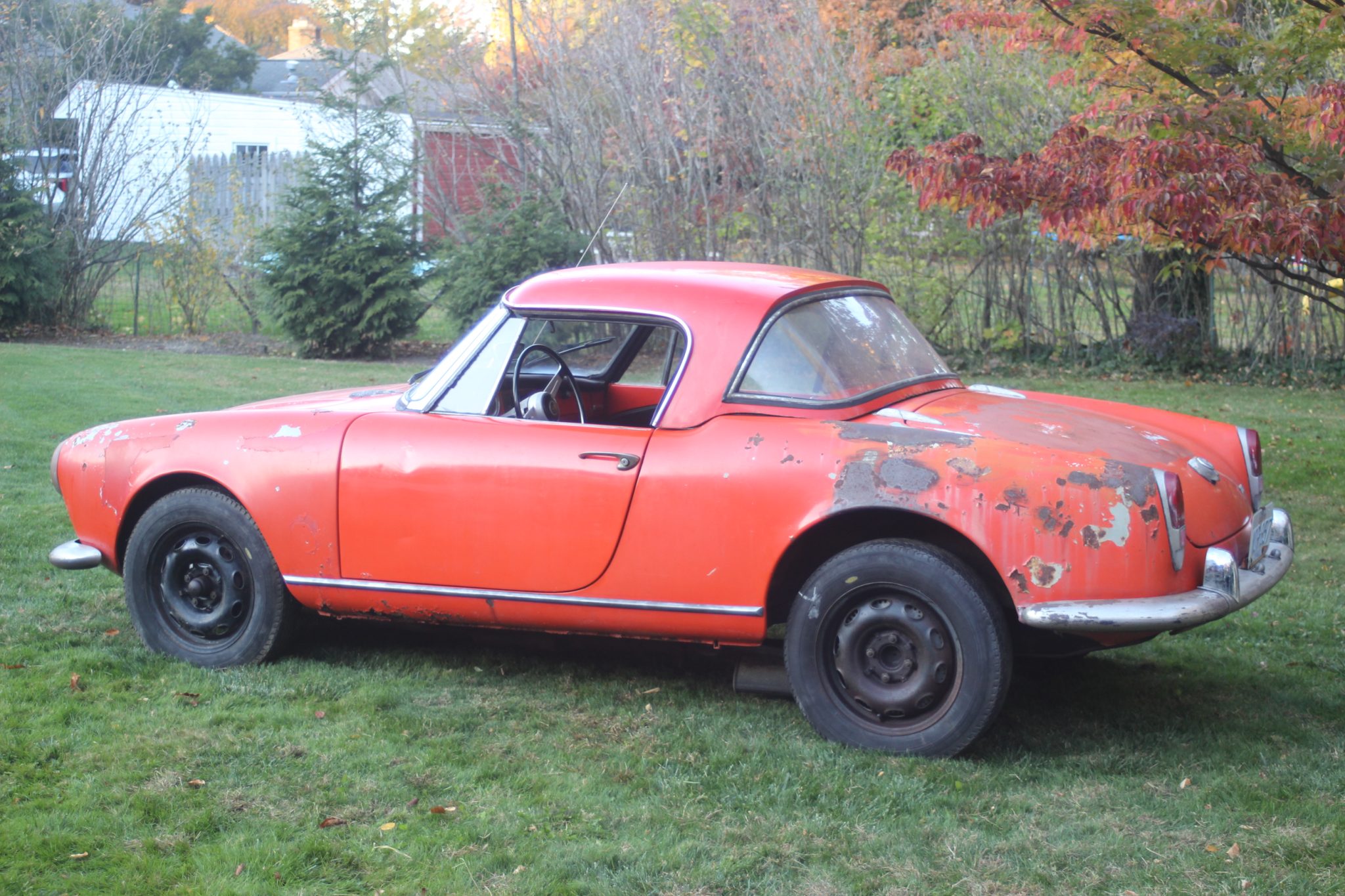 Corrosion is visible on the 15″ steel wheels, and the 165-series Le Havre radial tires require replacement. The car is equipped with front disc brakes accompanied by rear drums.