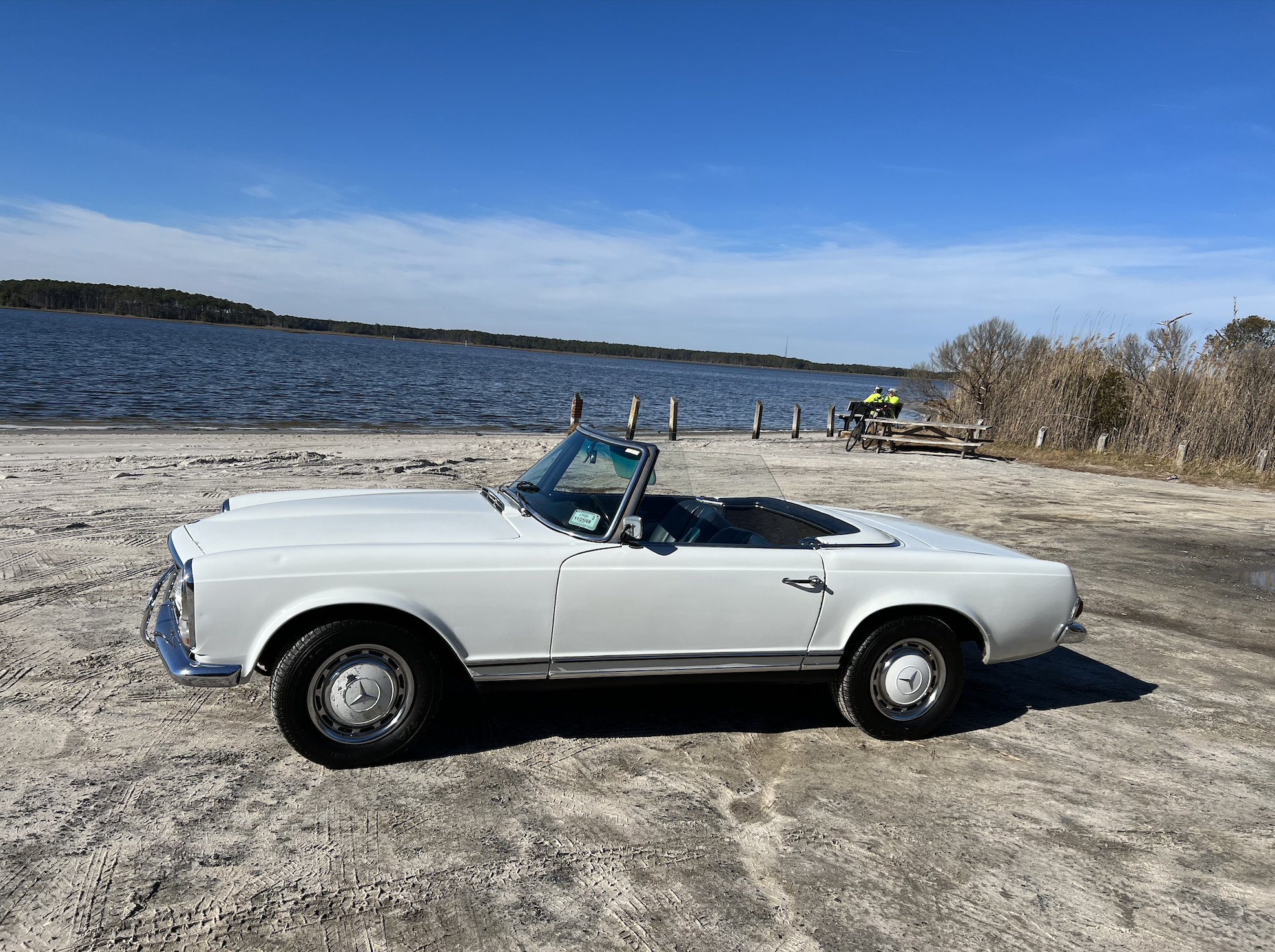 Steel 14″ wheels wear covers with body-color centers and are wrapped in 225/60 BFGoodrich Radial T/A tires that were mounted in 2021. A spare and jack are mounted in the trunk. The right rear caliper was replaced in 2021. A leak in the steering box is noted, and records shown in the gallery note that service is recommended for the steering idler arm, steering knuckle support, and outer tie rod.