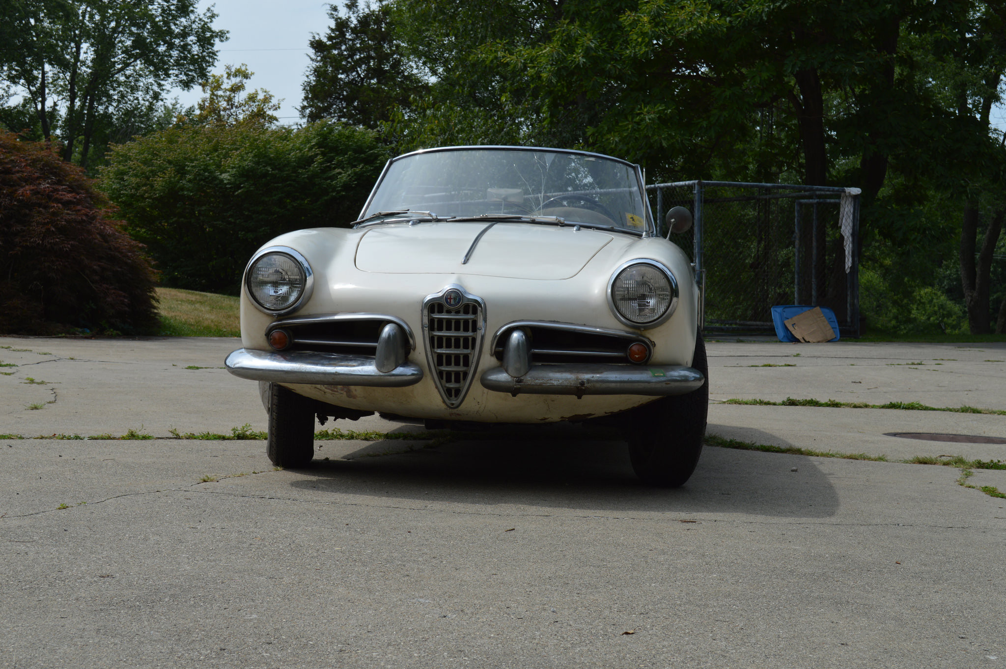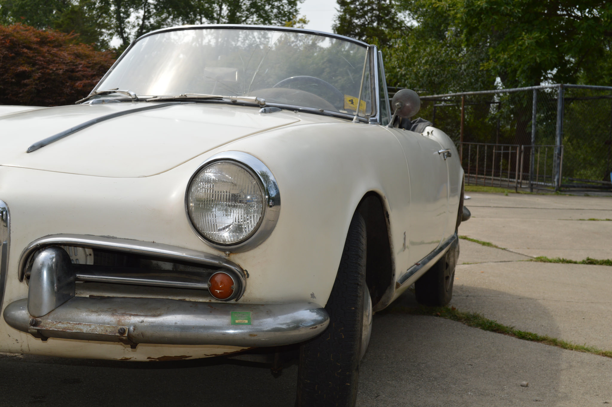All the original exterior trim is present including bumpers, wheels, hubcaps, and lights. The chrome is in serviceable condition for a driver but would likely need to be redone for a restoration. 1960 was a transition year for Giuliettas with the longer wheelbase 101-series replacing the outgoing 750-series cars. Small tail lights on this car are a good look.