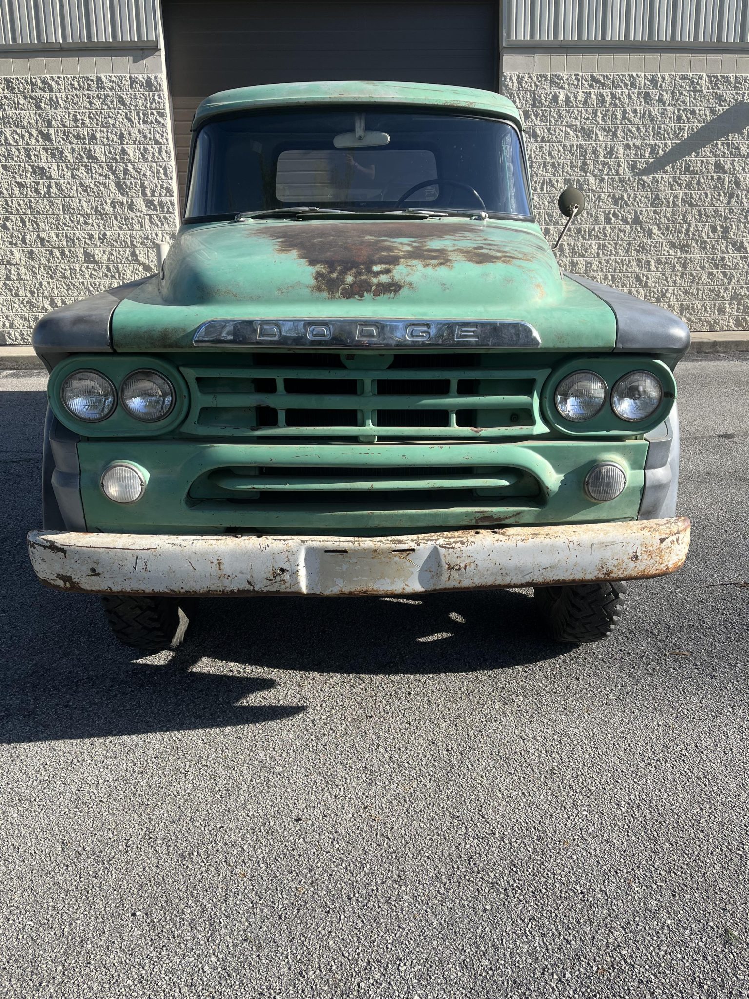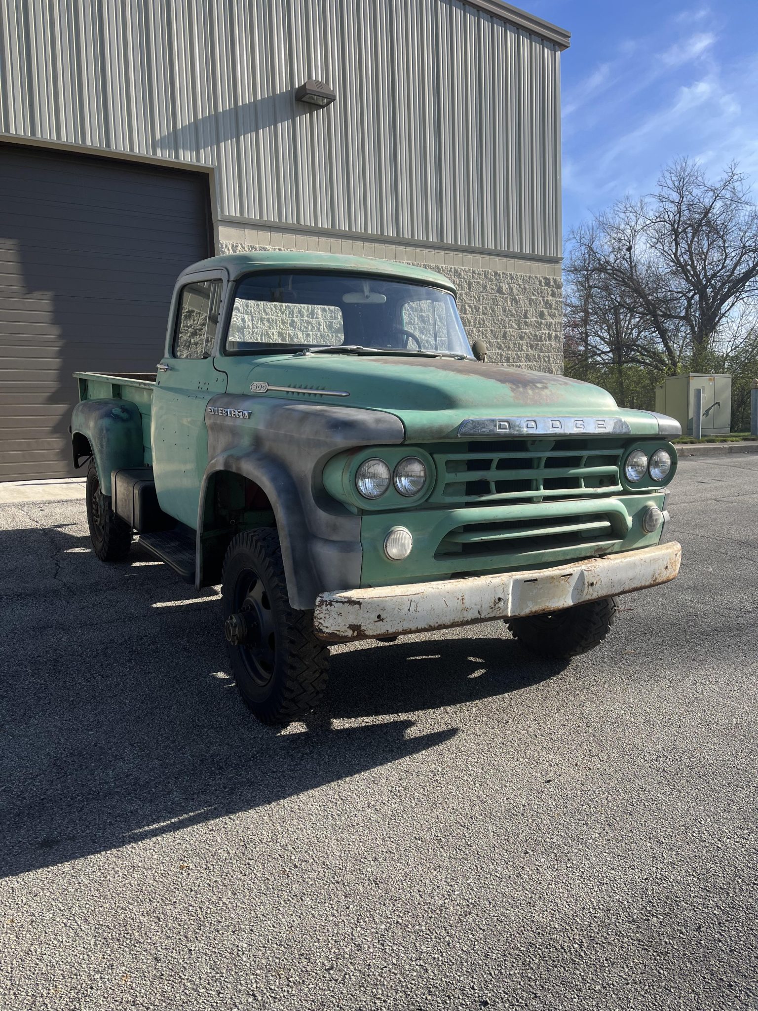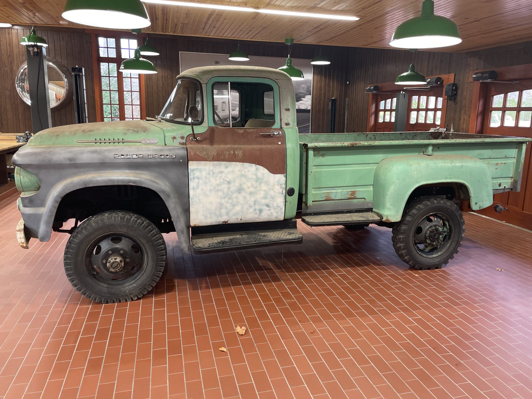 Six-lug 19.5″ steel wheels wear aged, mismatched tires, and the front wheels are mounted over manually locking hubs. A spare wheel and tire are stowed in the bed, and braking is handled by four-wheel drums.