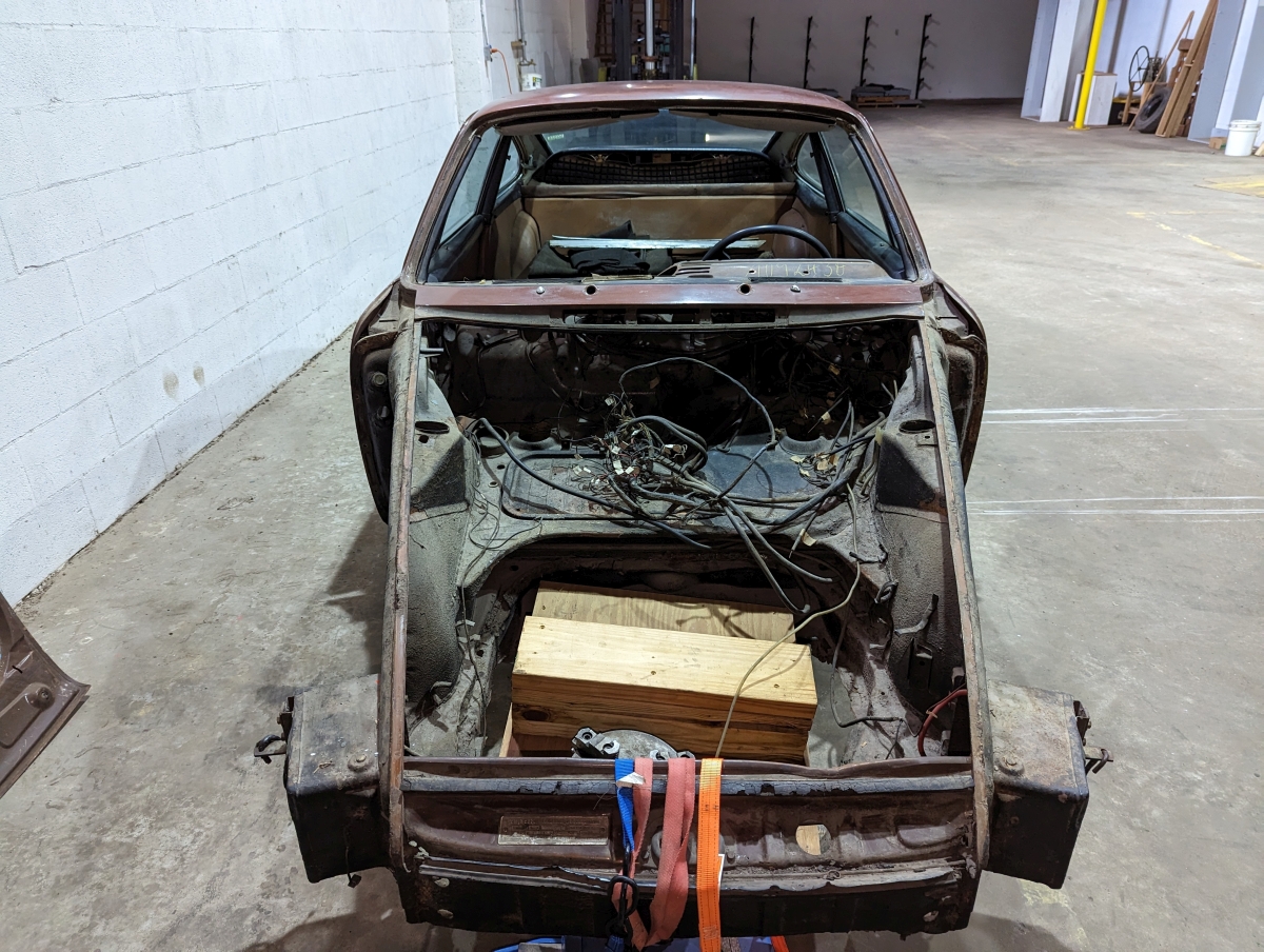 The rear 15″ Fuchs wheels are wrapped in a mix of older tires. The front axles, suspension components, and wheels have been removed and accompany the vehicle.