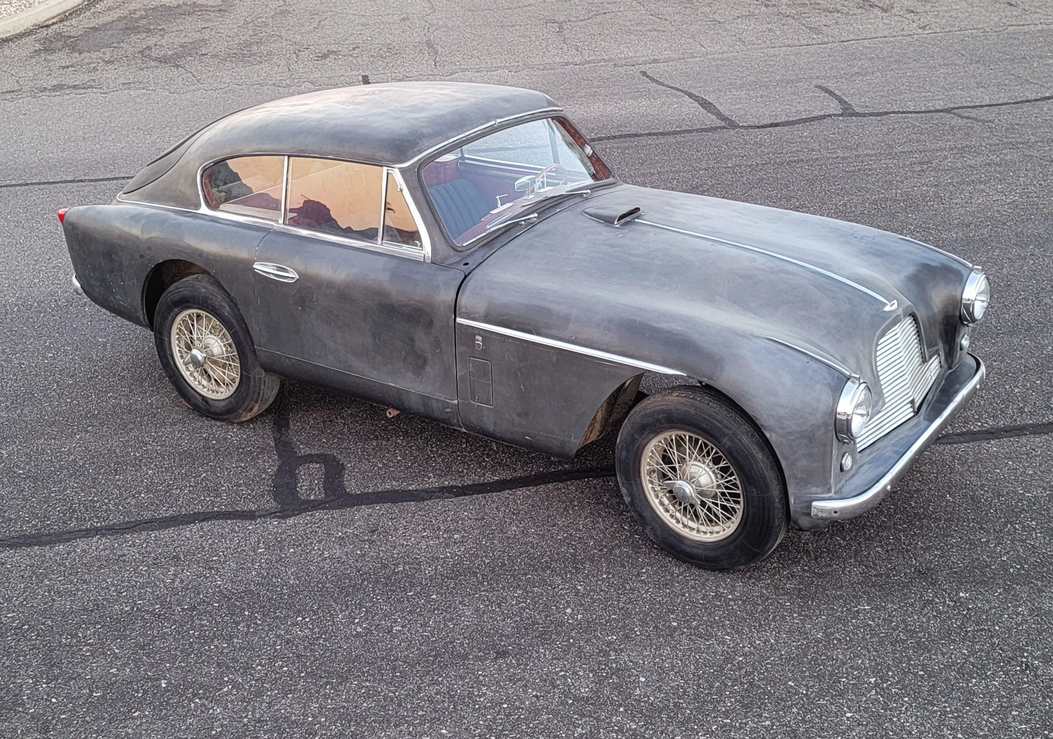 Silver-finished 16″ wire wheels are mounted with older Michelin tires that the seller recommends replacing. The car is equipped with independent front suspension and a solid rear axle as well as coil springs and drum brakes at each corner.