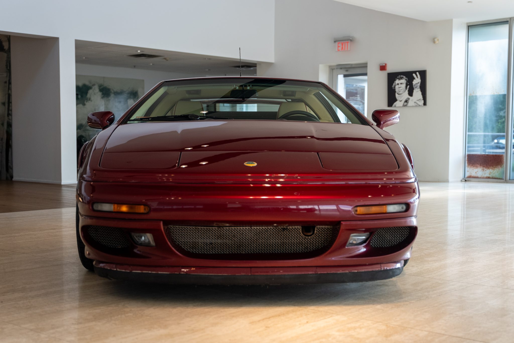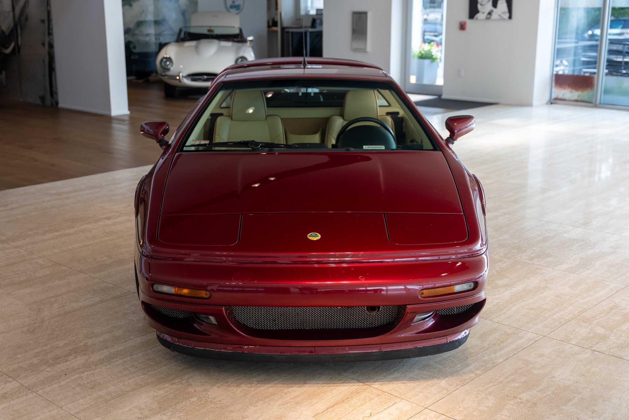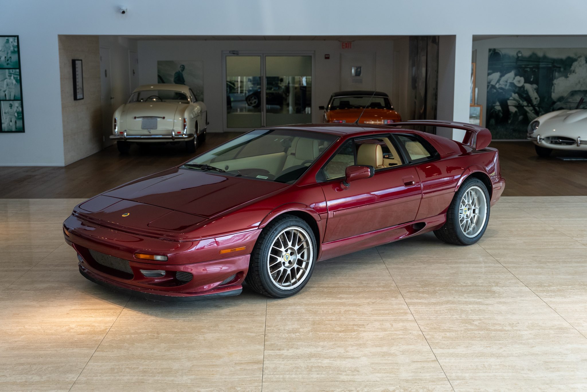 Staggered-width 17″ and 18″ alloy wheels are mounted with Continental ContiSportContact 3 tires measuring 235/40 up front and 285/35 out back. Bilstein shocks have been installed, and braking is handled by cross-drilled rotors at all four corners with Lotus-branded AP Racing calipers up front. Curb marks are visible on the wheels.