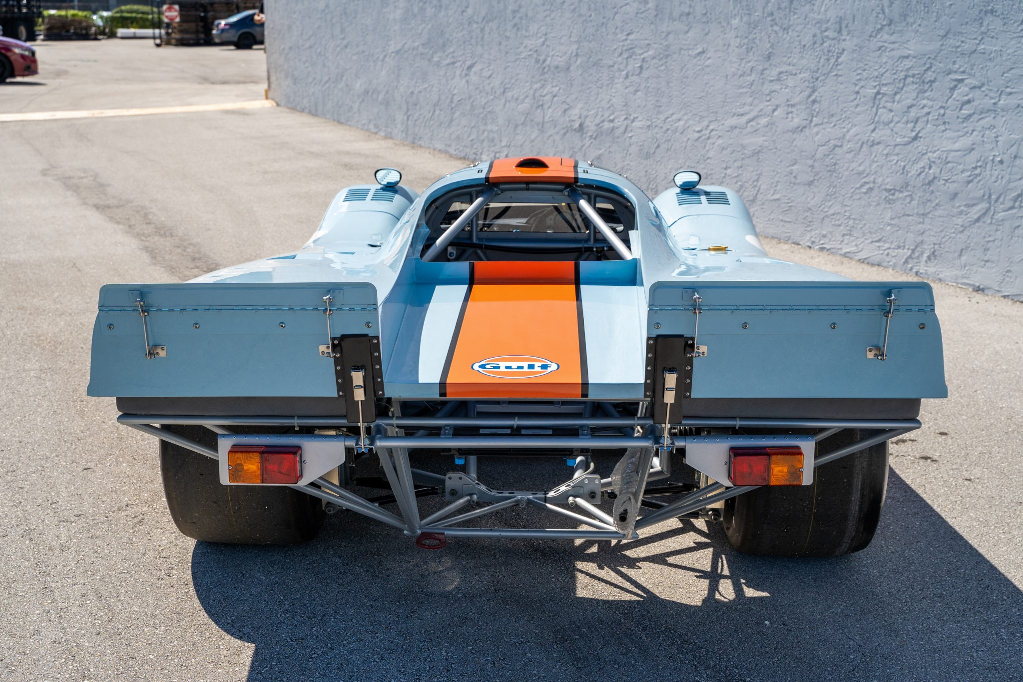 Measuring approximately 1” taller and 4” longer than the original 917K model, the Bailey 917’s bodywork comprises eight fiberglass panels, which on this example wear a pale blue and orange Gulf livery that is said to have been re-wrapped within the last six months. Features include forward-hinged doors, hinged Gurney flaps on each side of the tail panel, NACA ducts on the nose and rear flanks, a shatterproof glass wraparound windshield, polycarbonate side windows with hinged vents, faired headlights, and dual fender-mounted side mirrors. Scuffs on the underside of the chin can be seen up close in the photo gallery below.