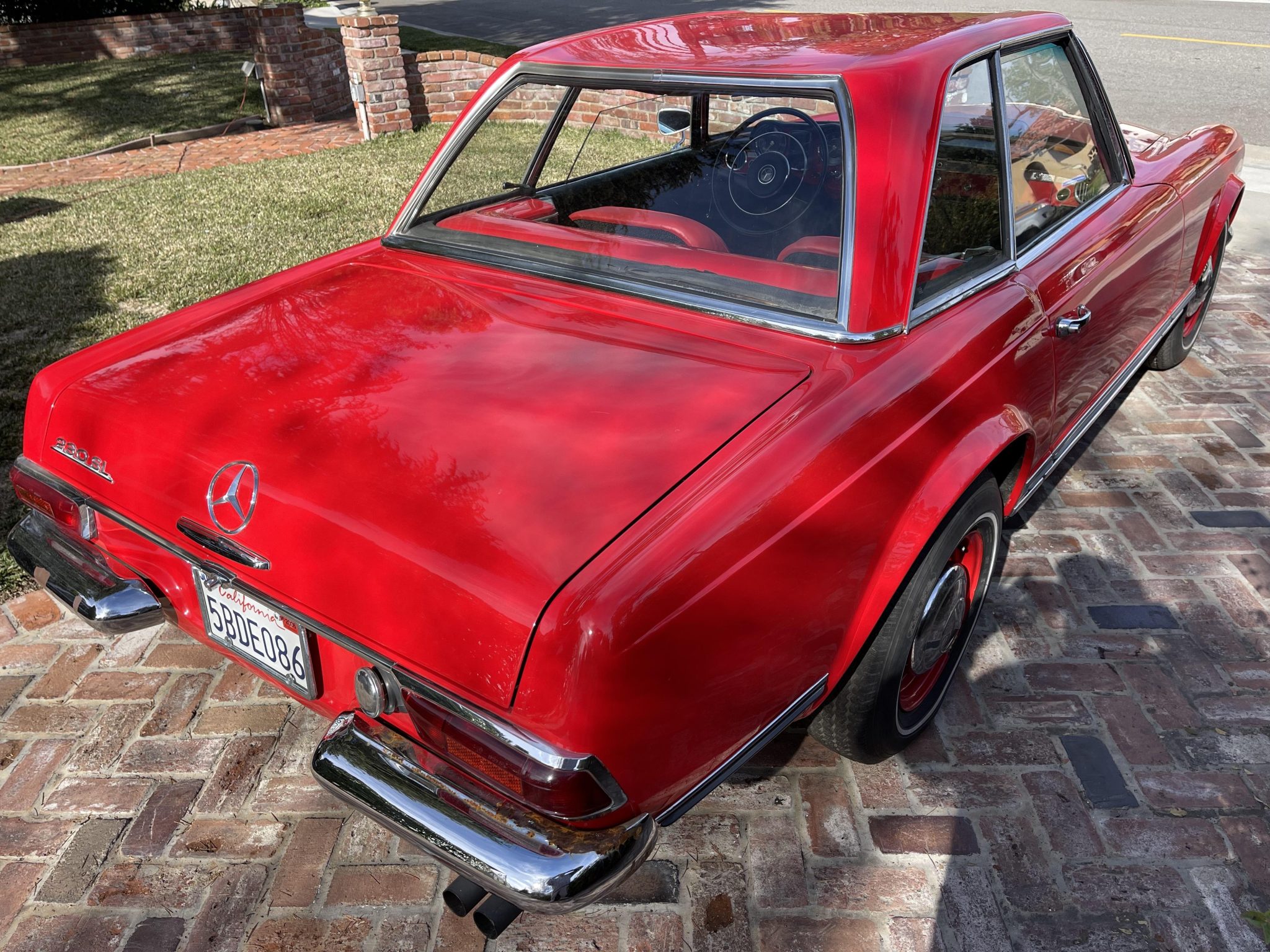 The red-finished 14″ steel wheels feature polished hubcaps and are mounted with 185-series Michelin tires. The car is equipped with power steering, and braking is provided by power-assisted front discs and rear drums.