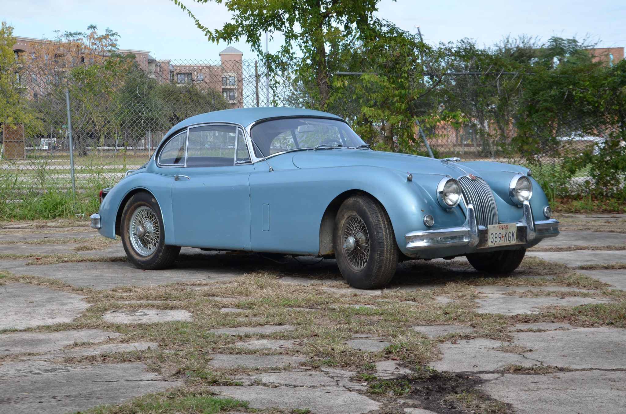 Knock-off 16″ wire wheels show corrosion, and the finish on the knock-off spinners is flaking. The car is equipped with four-wheel disc brakes.