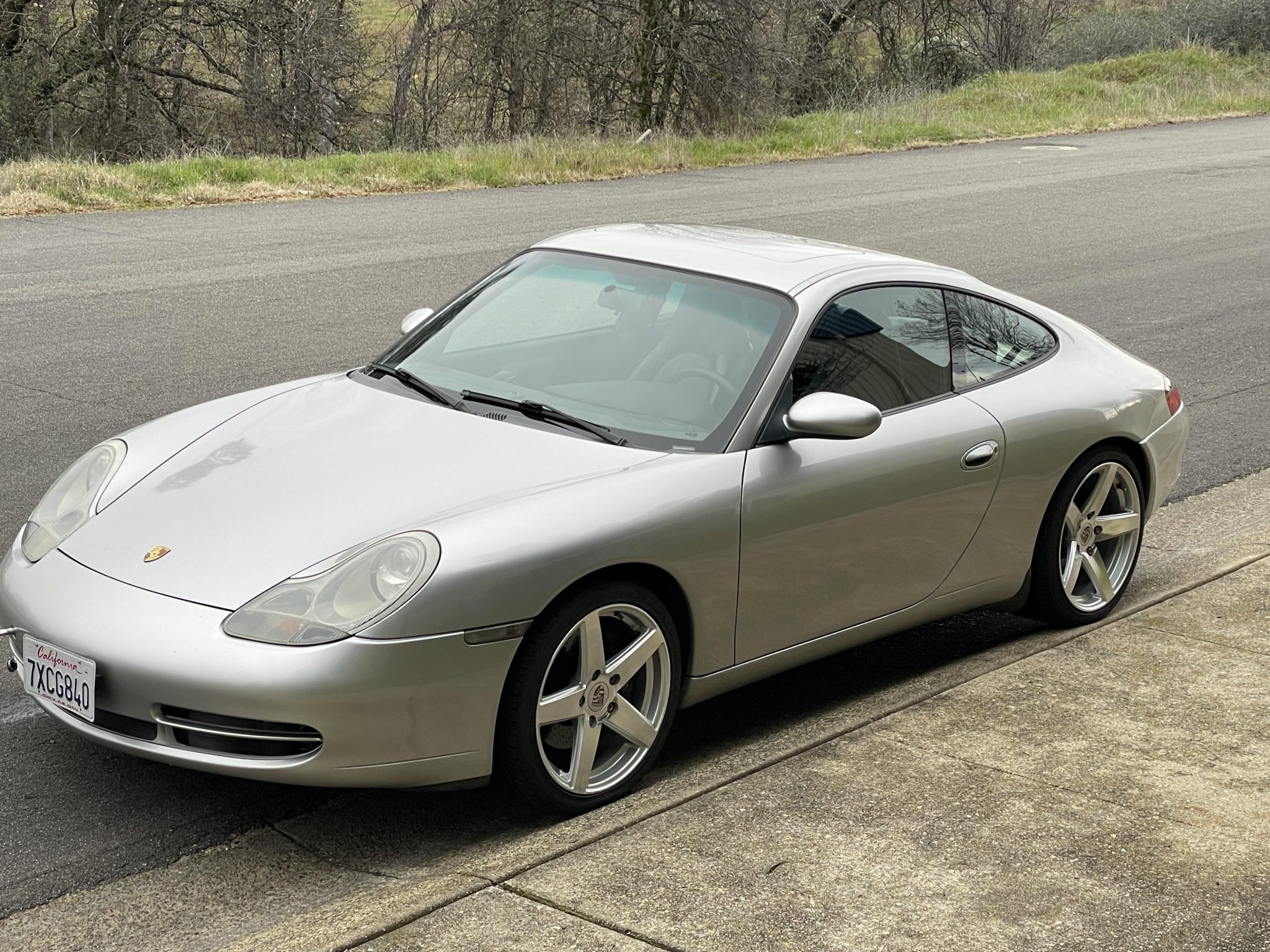 The 18″ aftermarket wheels are mounted with a worn set of Toyo tires that the seller recommends replacing, and braking is handled by four-piston Porsche-branded calipers fitted over cross-drilled rotors at all four corners.