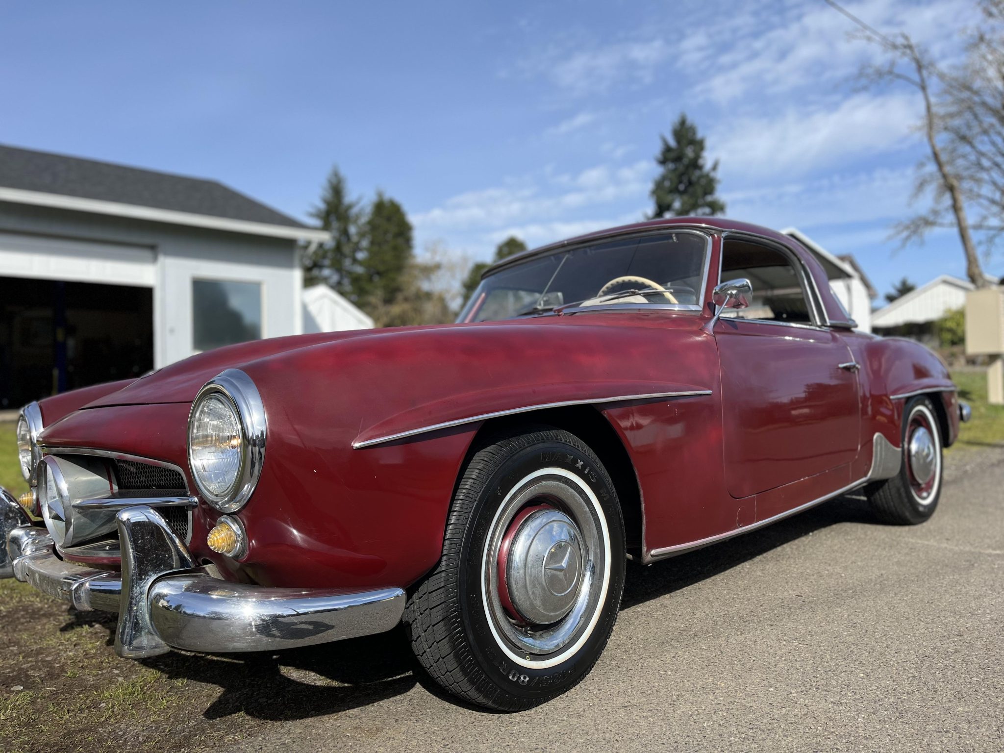 Steel body-colored 13″ wheels with chrome hubcaps wear 185/80 Maxxis whitewall tires. The car is equipped with double-wishbone front suspension, rear swing axles with coil springs, and power-assisted drum brakes.