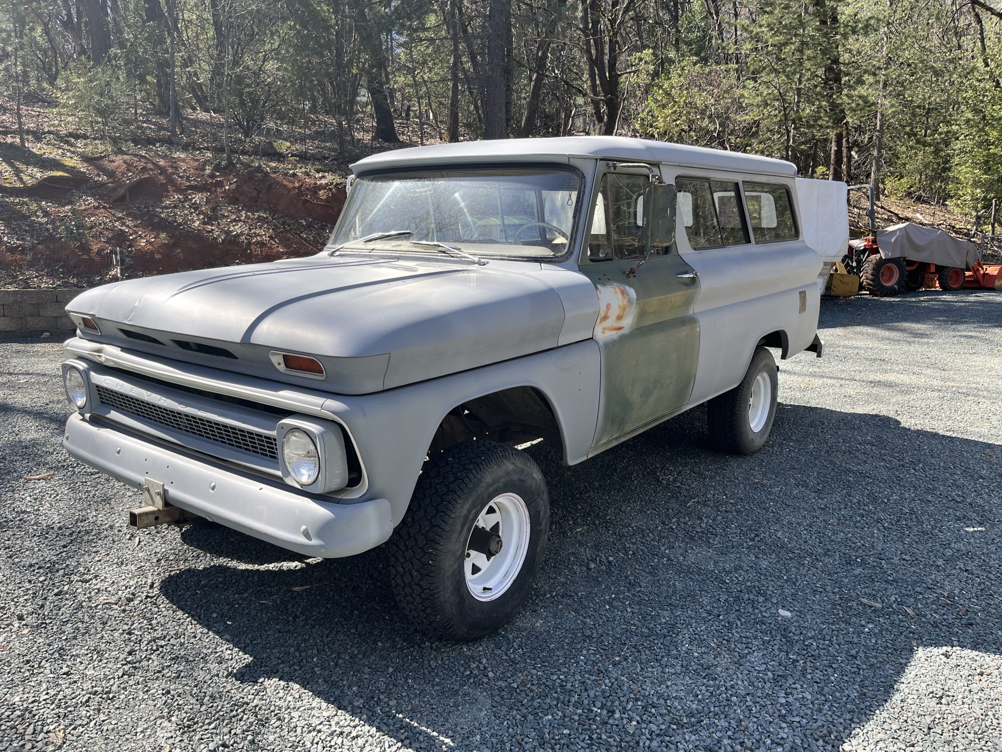 Steel wheels are finished in white and wrapped in tires that should be replaced due to age, per the seller. The front brakes were replaced in preparation for the sale.