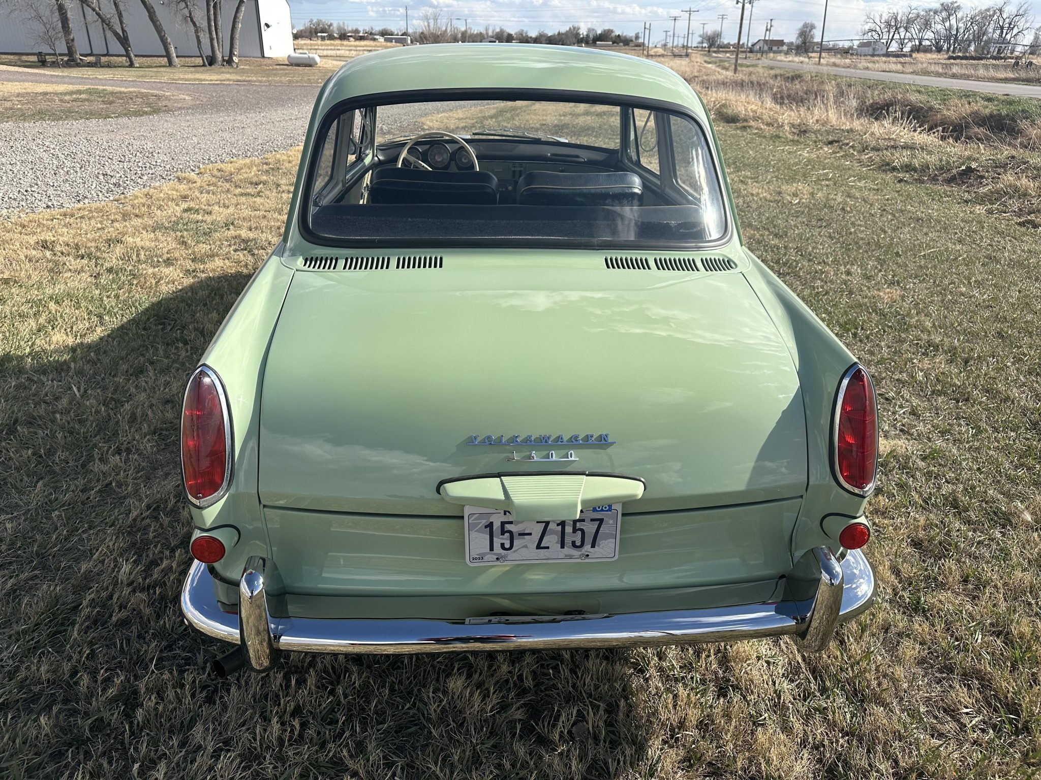 Gray-finished 15″ steel wheels wear chrome VW-branded hubcaps and are mounted with 175/65 Hankook Optimo tires. The car is equipped with four-wheel drums and the front brakes are inoperative.