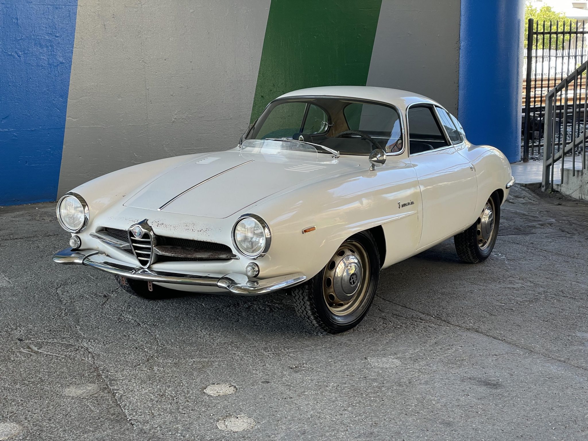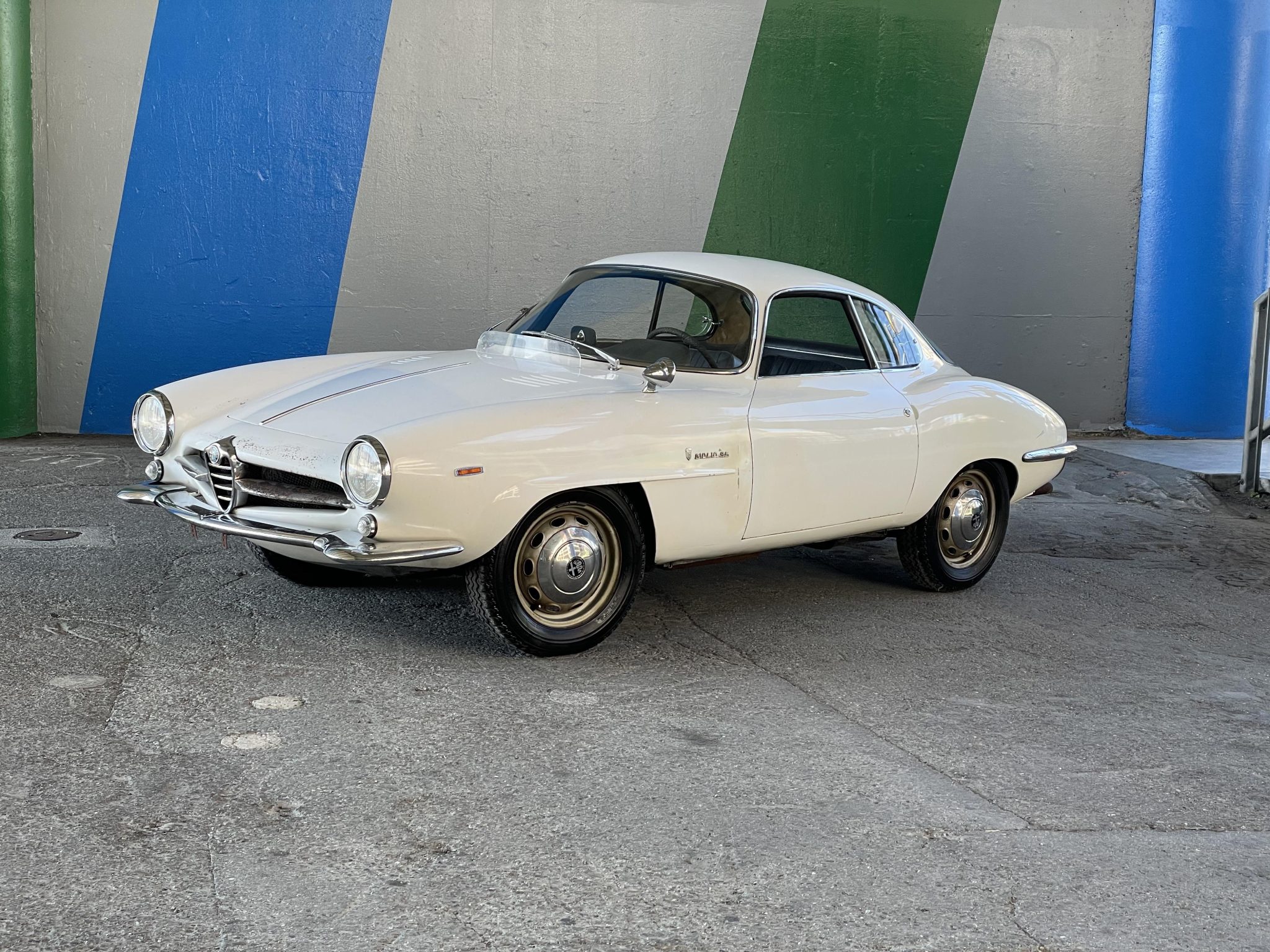 Silver-finished 15″ wheels wear Alfa Romeo-branded hubcaps and are mounted with older Michelin radial tires. The Giulia SS came fitted with front disc brakes from the factory.