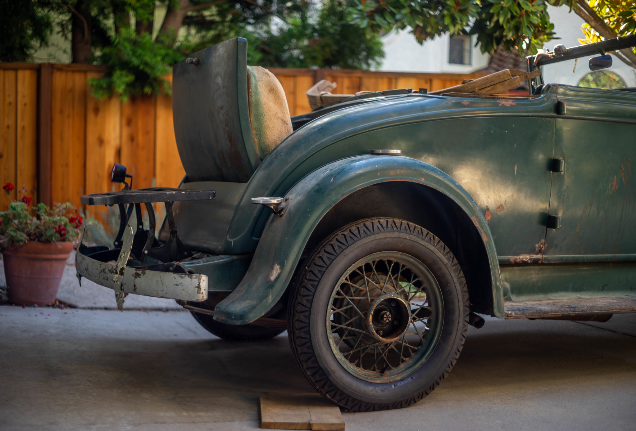 Body-colored 19″ wire wheels are equipped with older front tires that are cracked and in need of replacement, while new Firestone tires were mounted at the rear around 2013. Six Plymouth center caps have been retained and are included in the sale, along with two spare wheels.