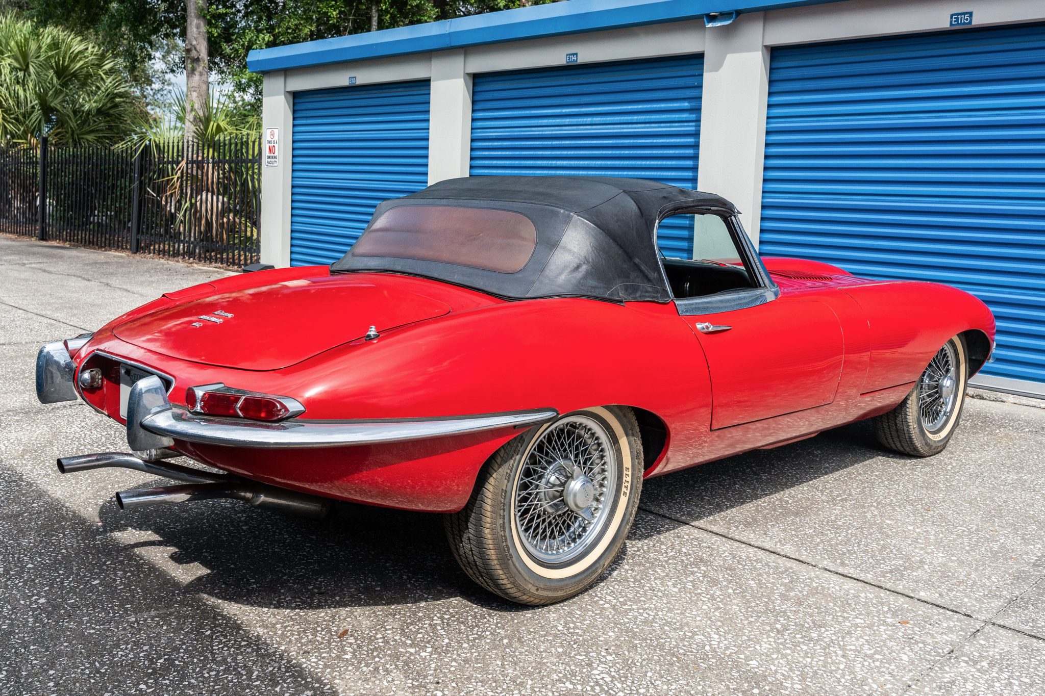 Silver-painted 15″ wire wheels are secured by branded two-eared knock-offs and mounted with older 215/70 Dunlop D65 Touring Elite thin-whitewall tires, and a matching spare with a Pirelli tire is stowed in the trunk. The car is equipped with rack-and-pinion steering, and braking is handled by four-wheel discs, the rears of which are mounted inboard.