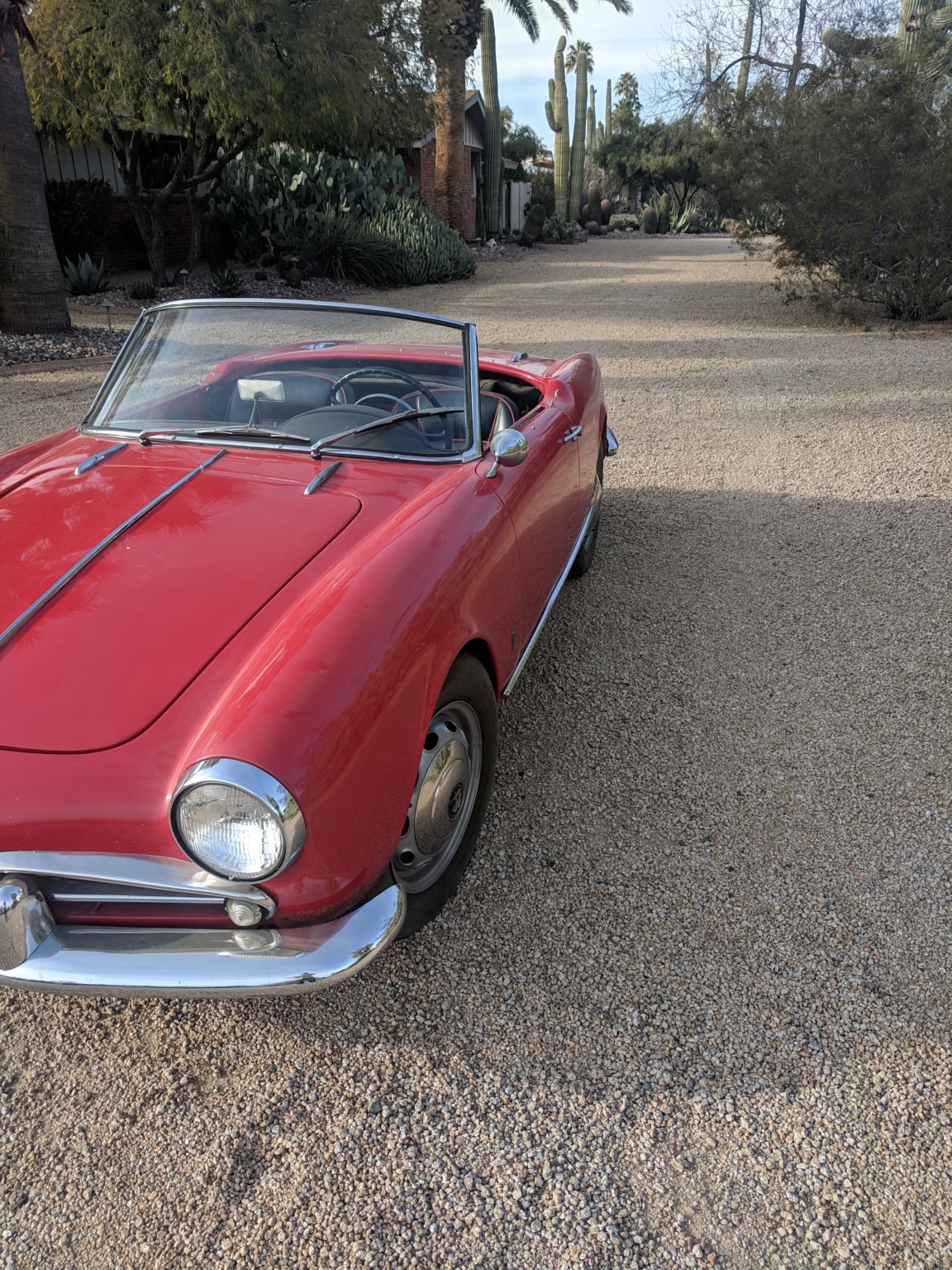 The black convertible top and frame stow behind the seats and a few blemishes are present in the canvas. Factory steel wheels wear a set of chrome hubcaps, and the seller indicates the brakes are currently pulling to the right and should be serviced before the car is driven any considerable distance.