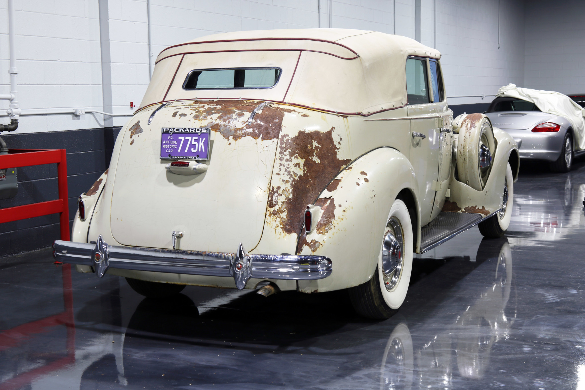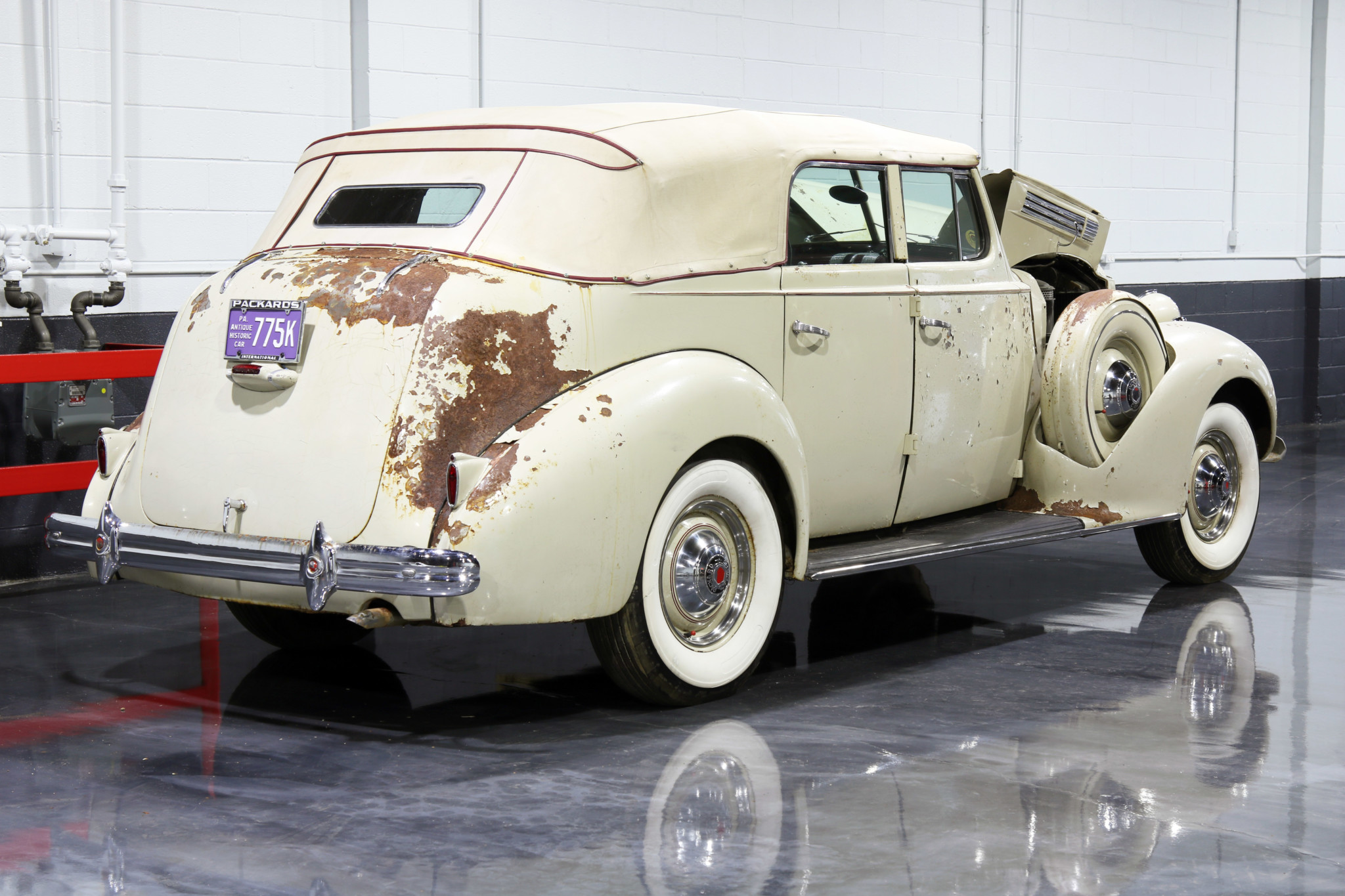 Exterior equipment includes fog lamps, a driver’s-side spotlight, and a fender-mounted spare tire. Painted steel wheels with pinstripes are equipped with polished beauty rings, chrome caps, and whitewall tires.