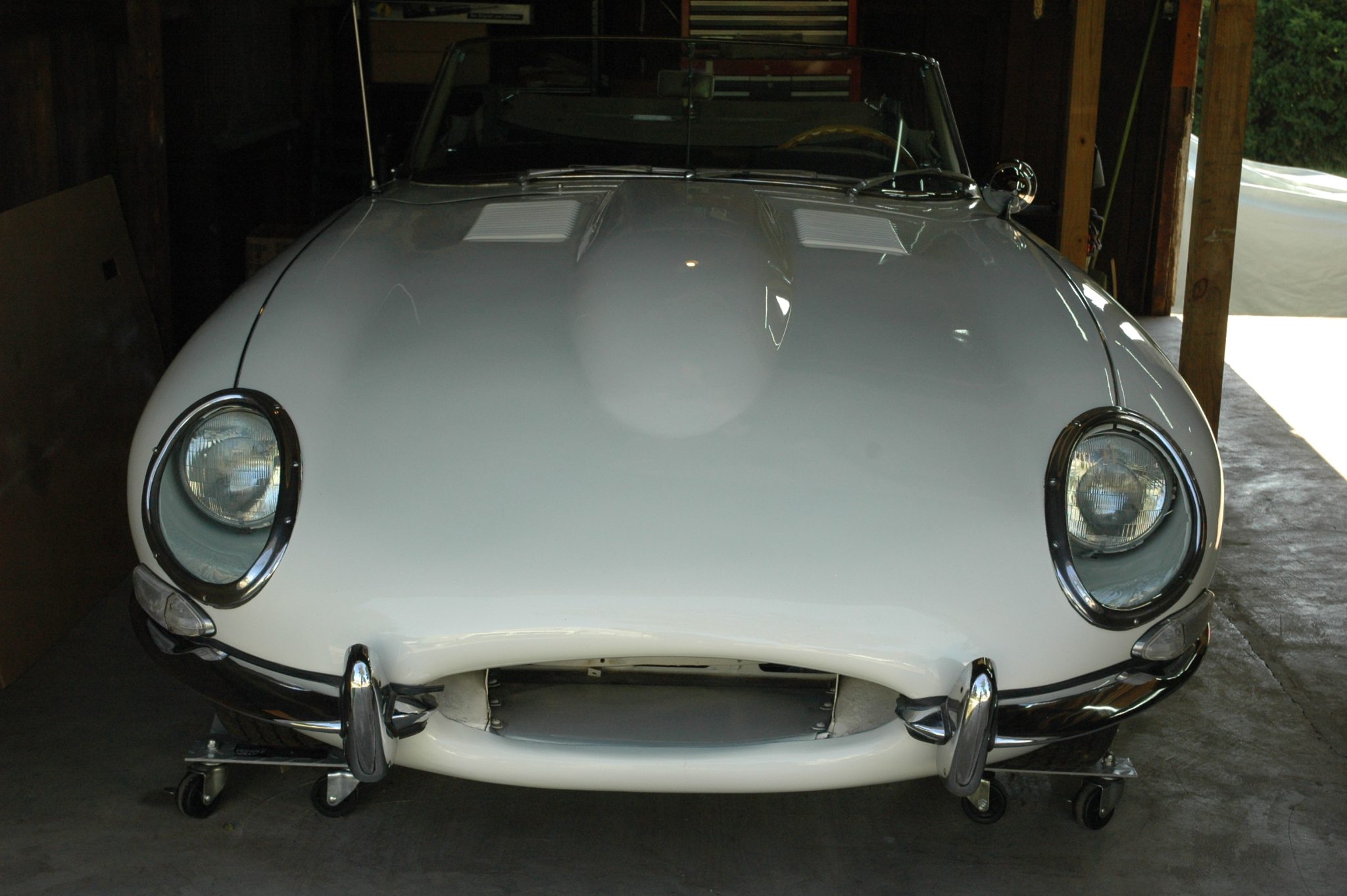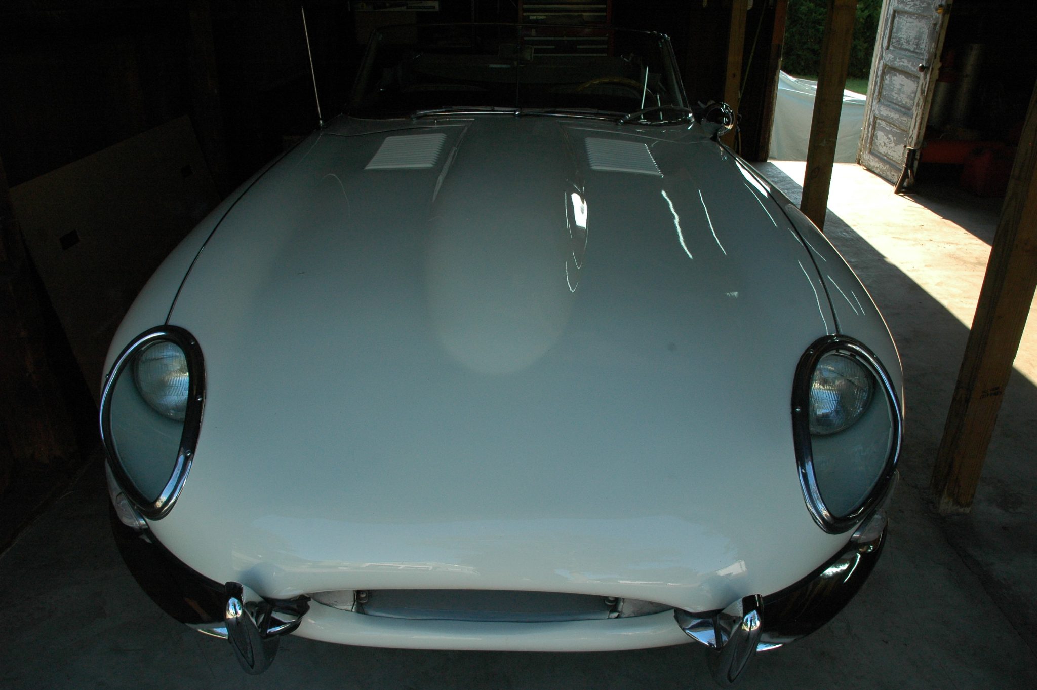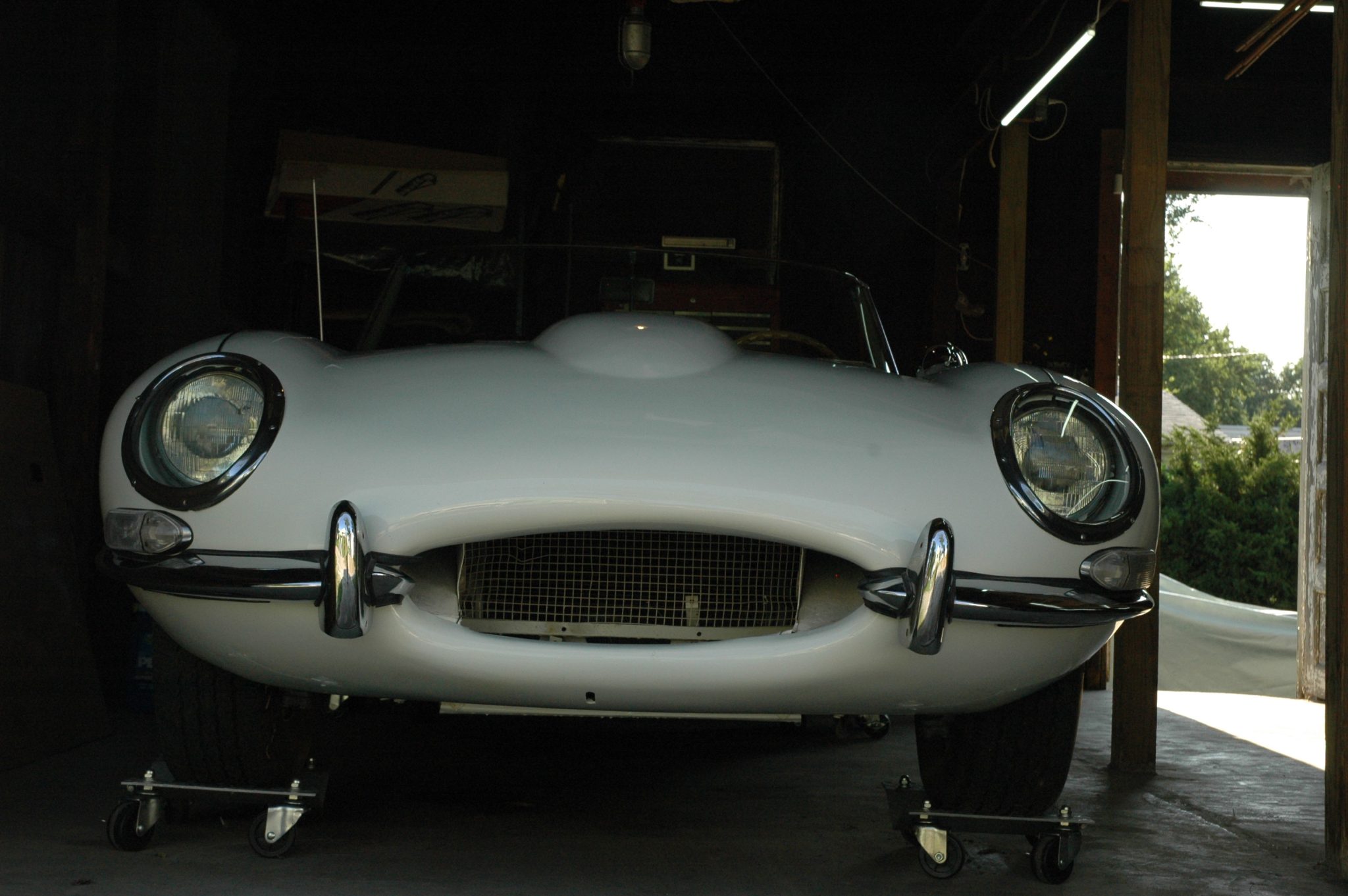 Wire 15″ wheels are secured by two-eared knock-offs and are mounted with thin whitewall tires. The car is fitted with four-wheel disc brakes. Damage to the strut below the battery is noted.