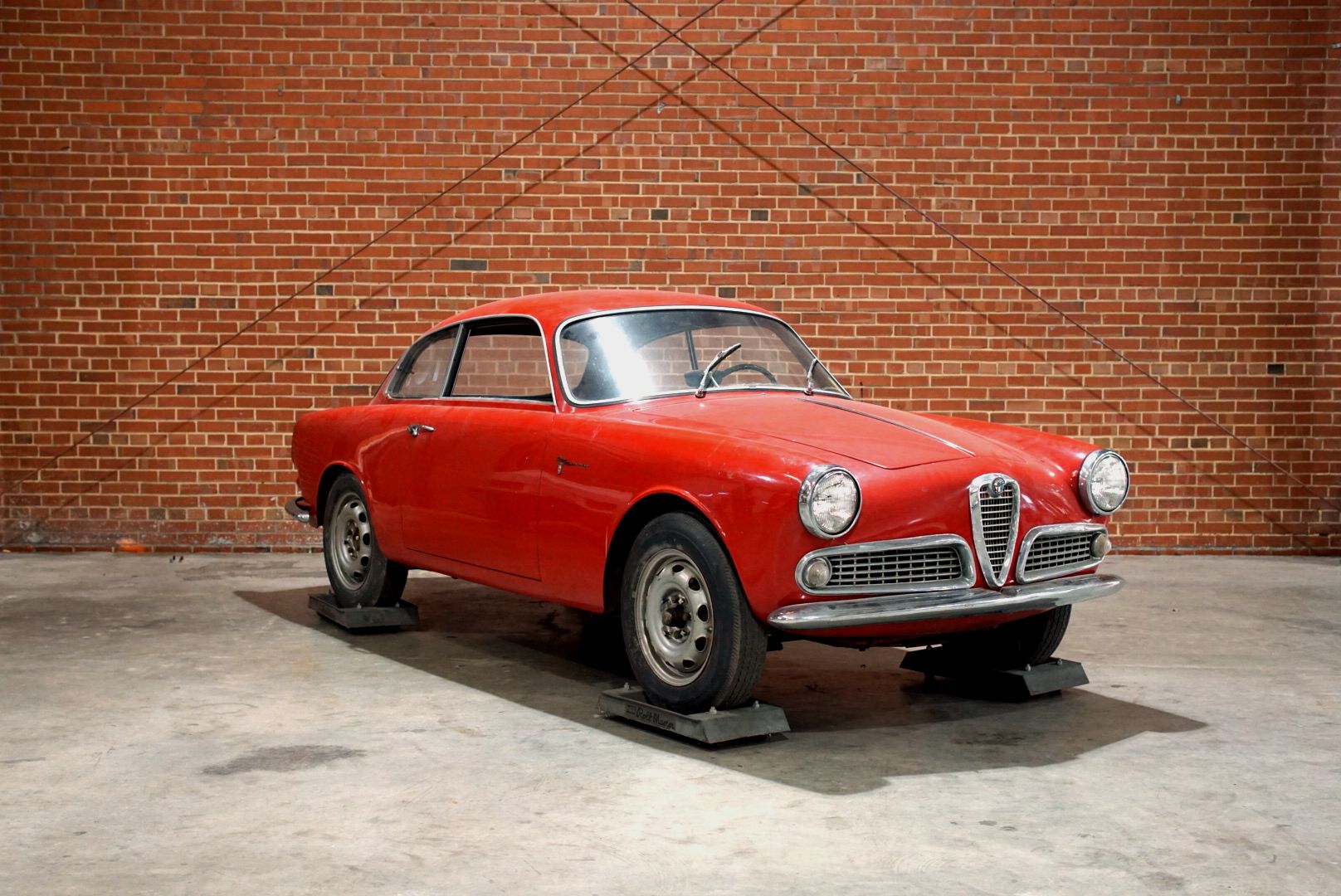 Ventilated 15″ steel wheels are mounted with older tires that require replacement, and the left-rear wheel exhibits corrosion. A set of four Alfa Romeo-branded hubcaps and a matching spare wheel will accompany the car. The car is equipped with finned four-wheel drum brakes, and the seller notes that the front-left brake is slow to release.