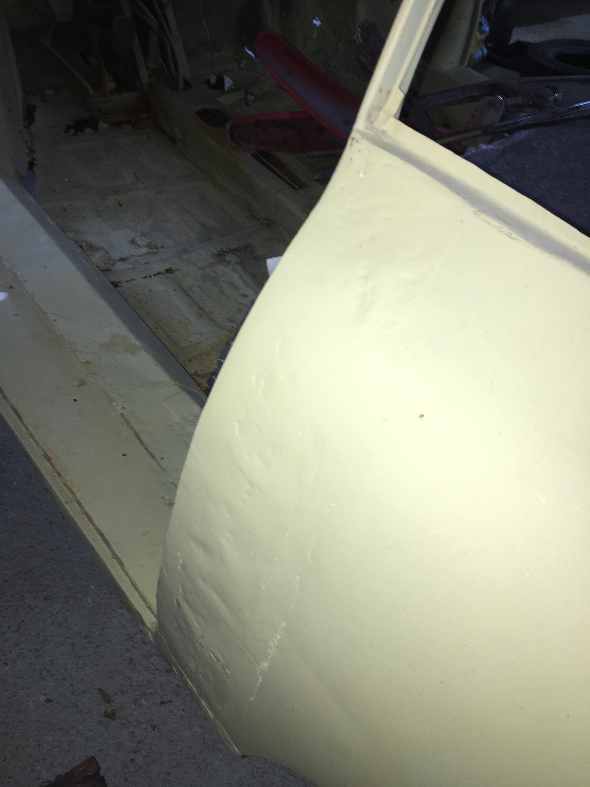 Substantial body rust is present and appears to be worse on the left side of the car than the right. The left front fender is dented in along its lower third.