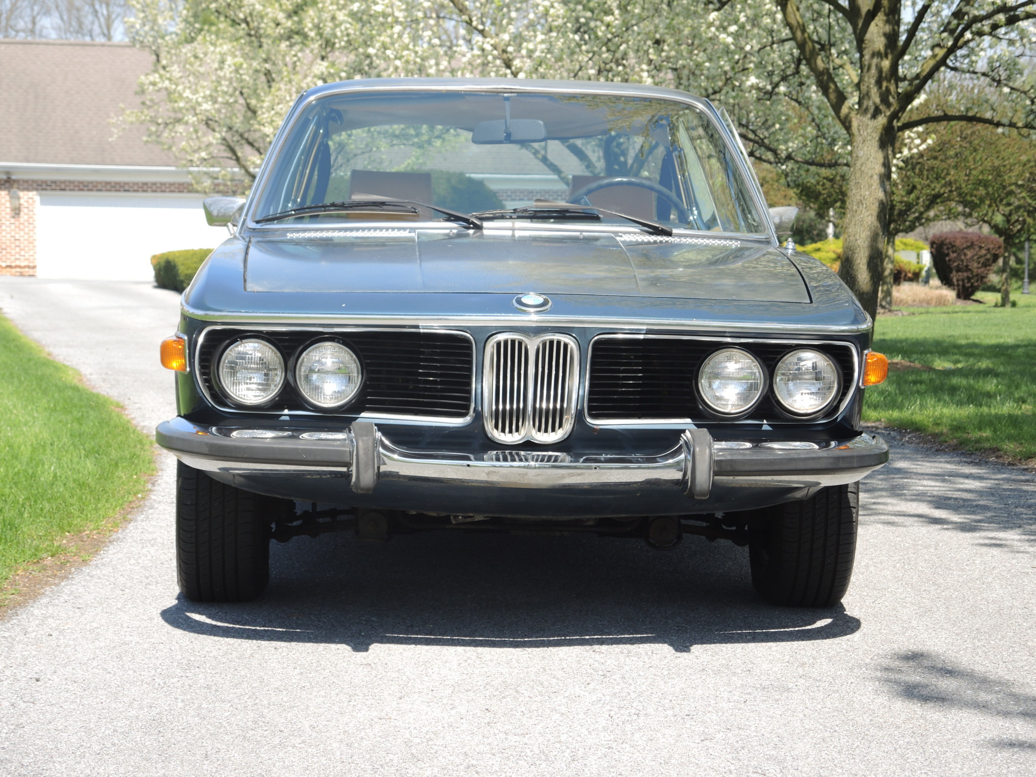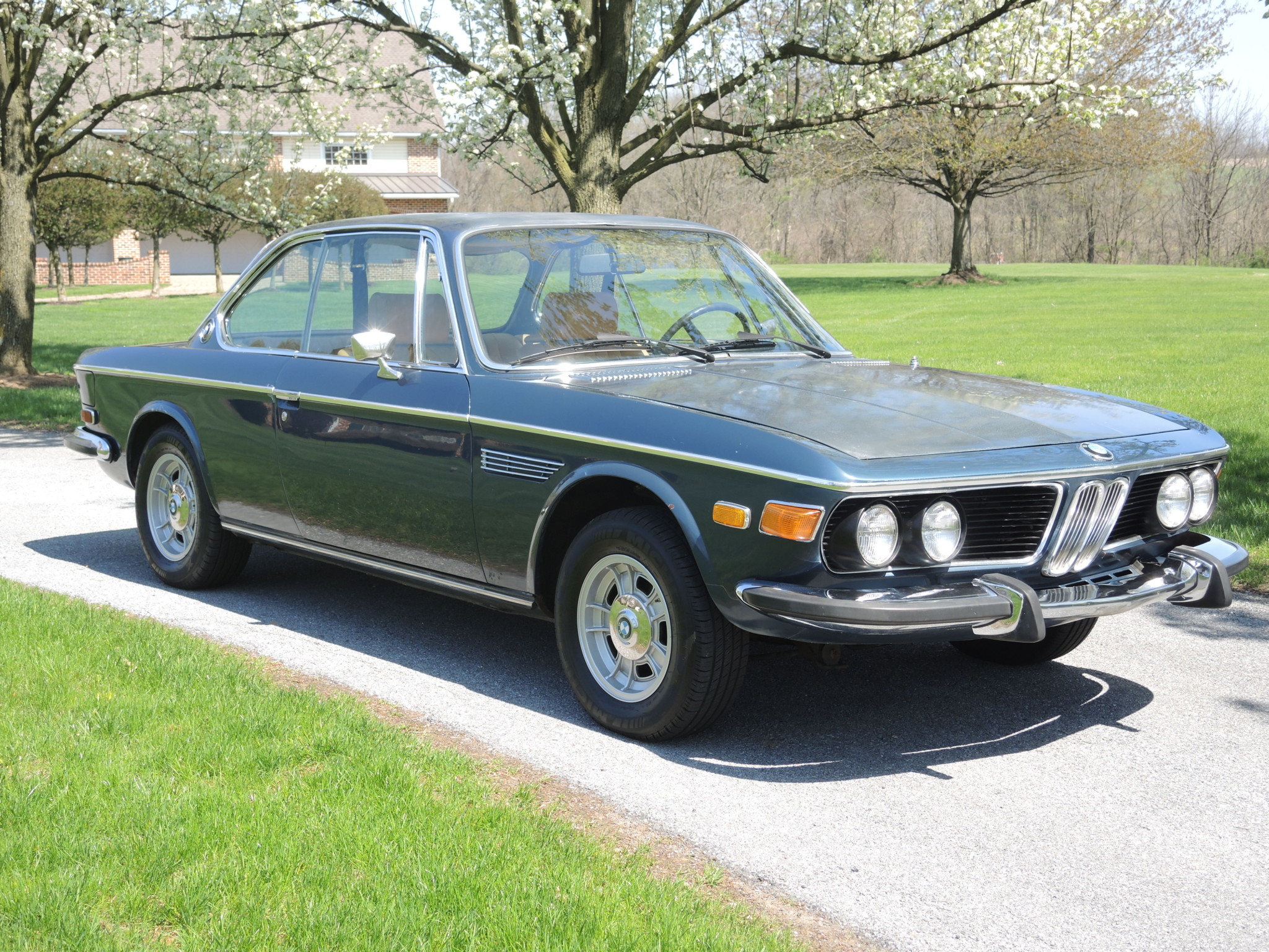 Factory 14″ alloy wheels are fitted with chrome BMW hubcaps and older Michelin tires. The seller states that the suspension requires servicing. Retained brightwork includes belt-line trim, side grilles, cowl vents, bumpers, trapezoidal mirrors, and window trim.