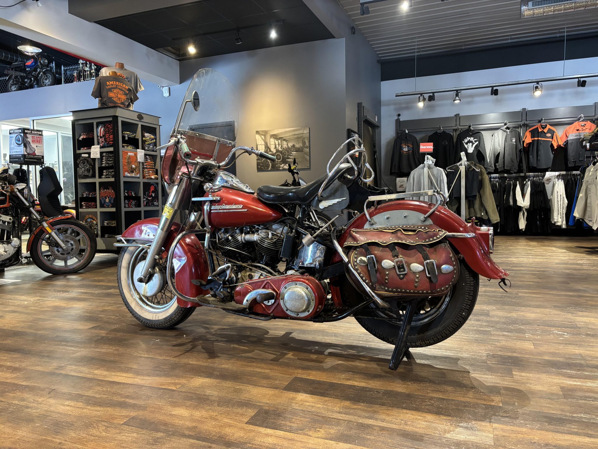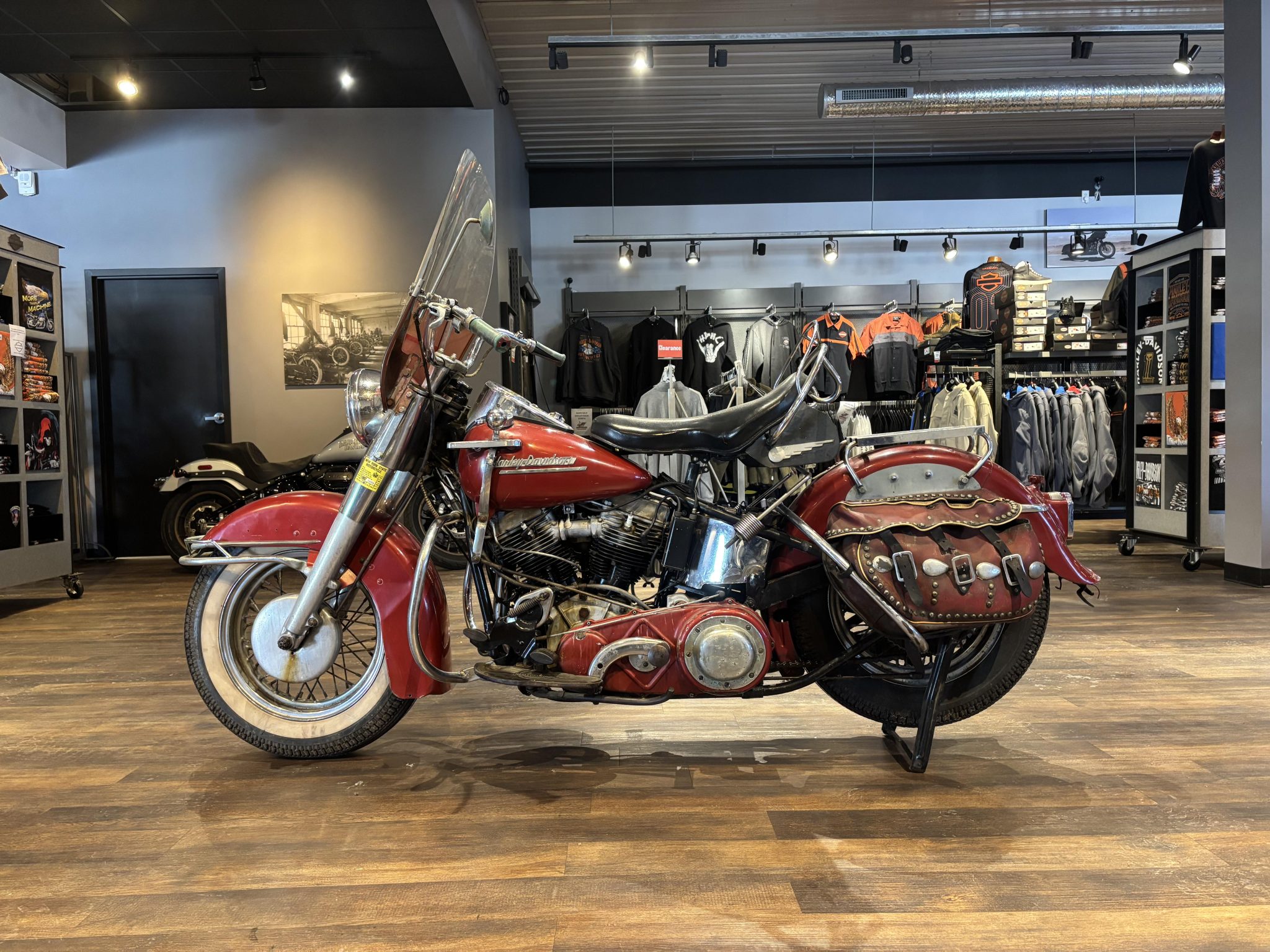Chrome 16″ rims are laced to drum-brake hubs and mounted with pie-crust whitewall tires that have formed flat spots. A Hydra Glide telescopic fork comprises the bike’s only suspension.