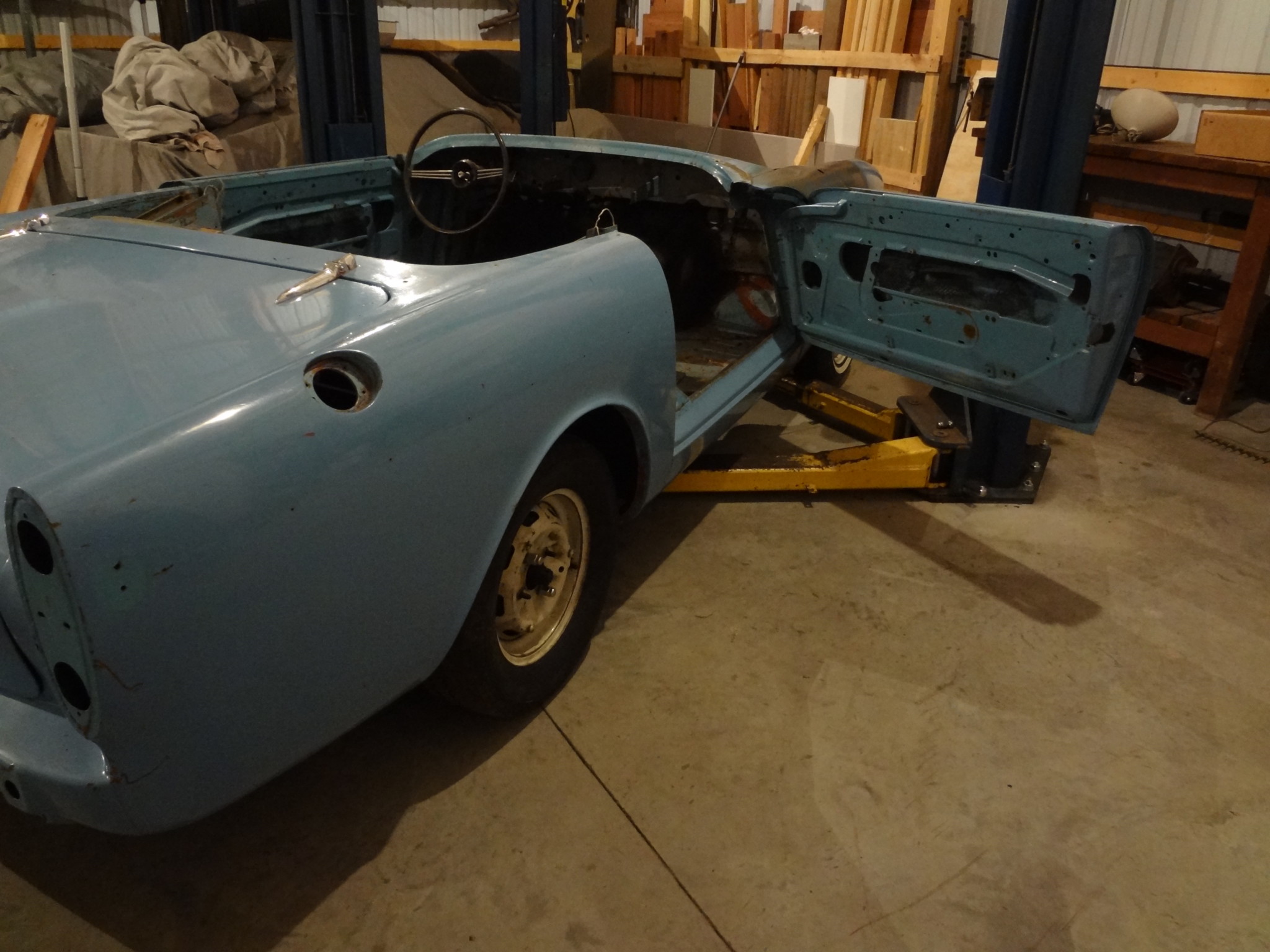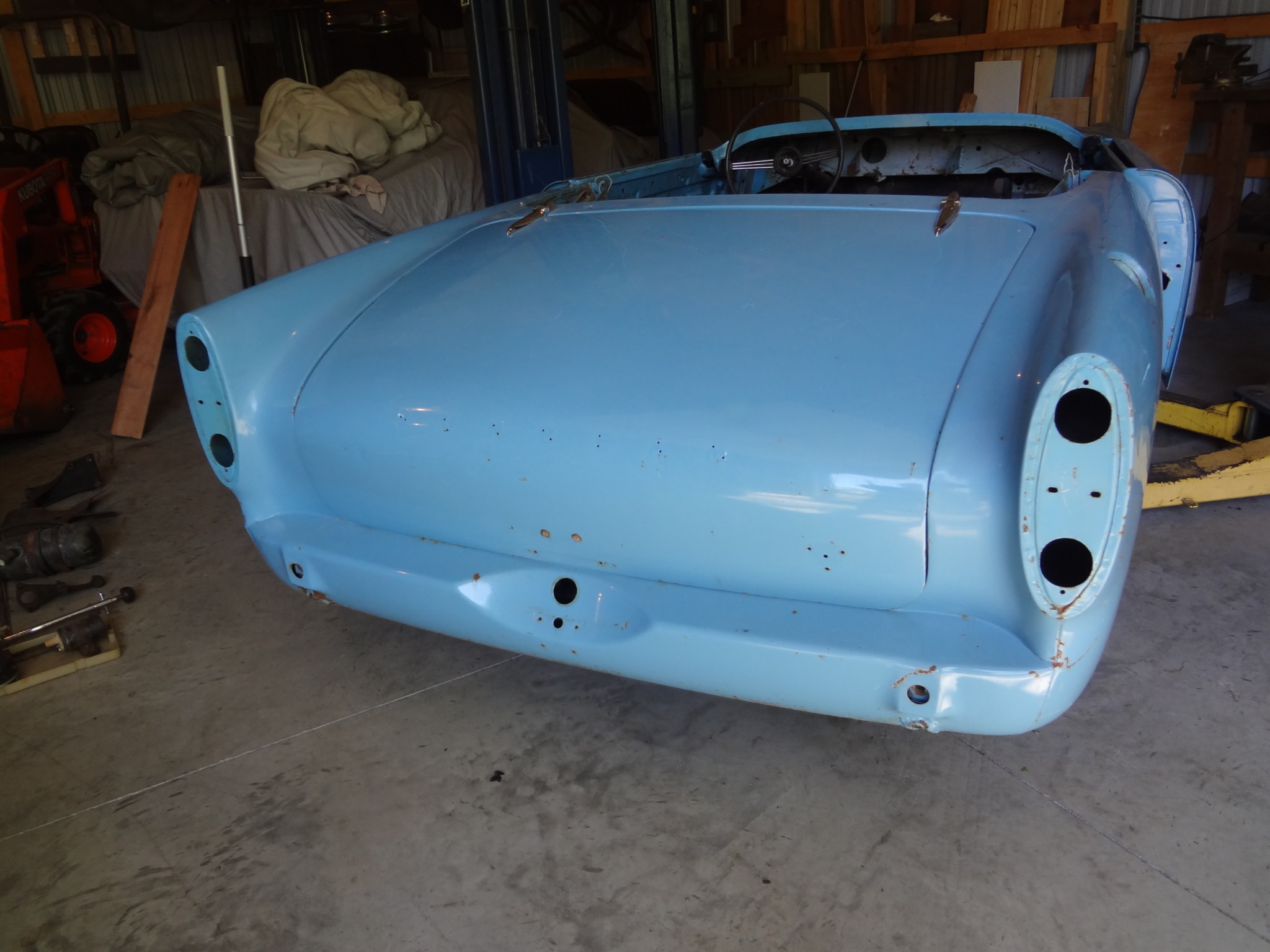 Trim and lighting have been removed, and the retained pieces are shown in the gallery along with the chrome bumpers and a replacement hood in white. The windshield and its chrome frame are also included, as are a black fabric top and bows.