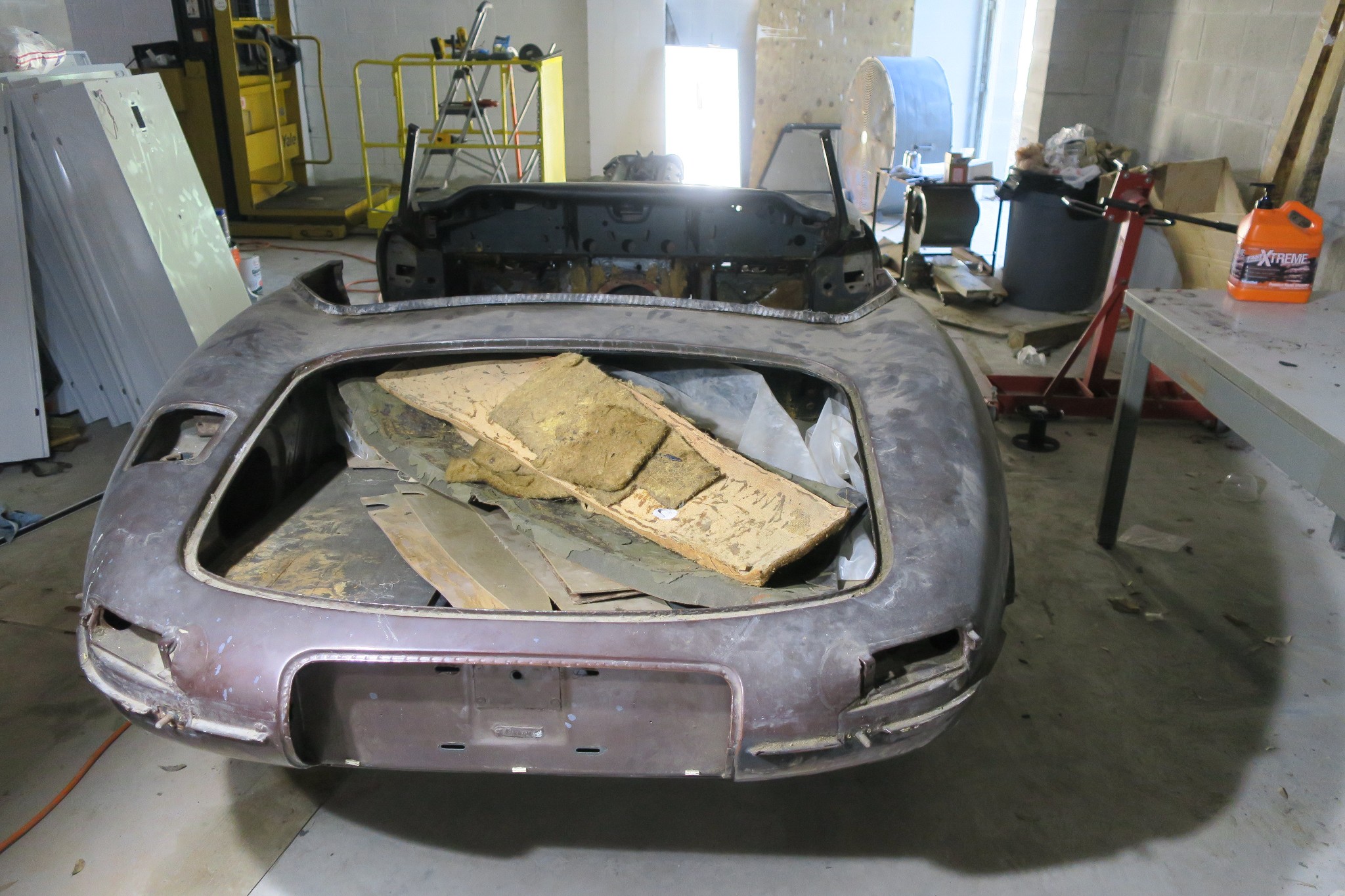 The interior has been fully stripped. The floors appear to be relatively solid, though rust is present where the door sills and kick panels meet the floors. A hole is present at the trailing edge of the passenger’s floor.