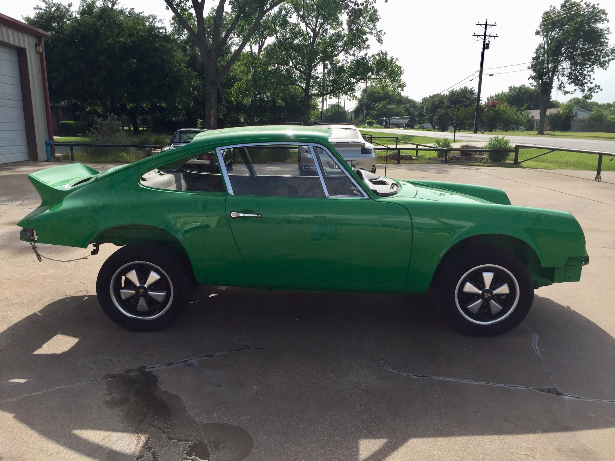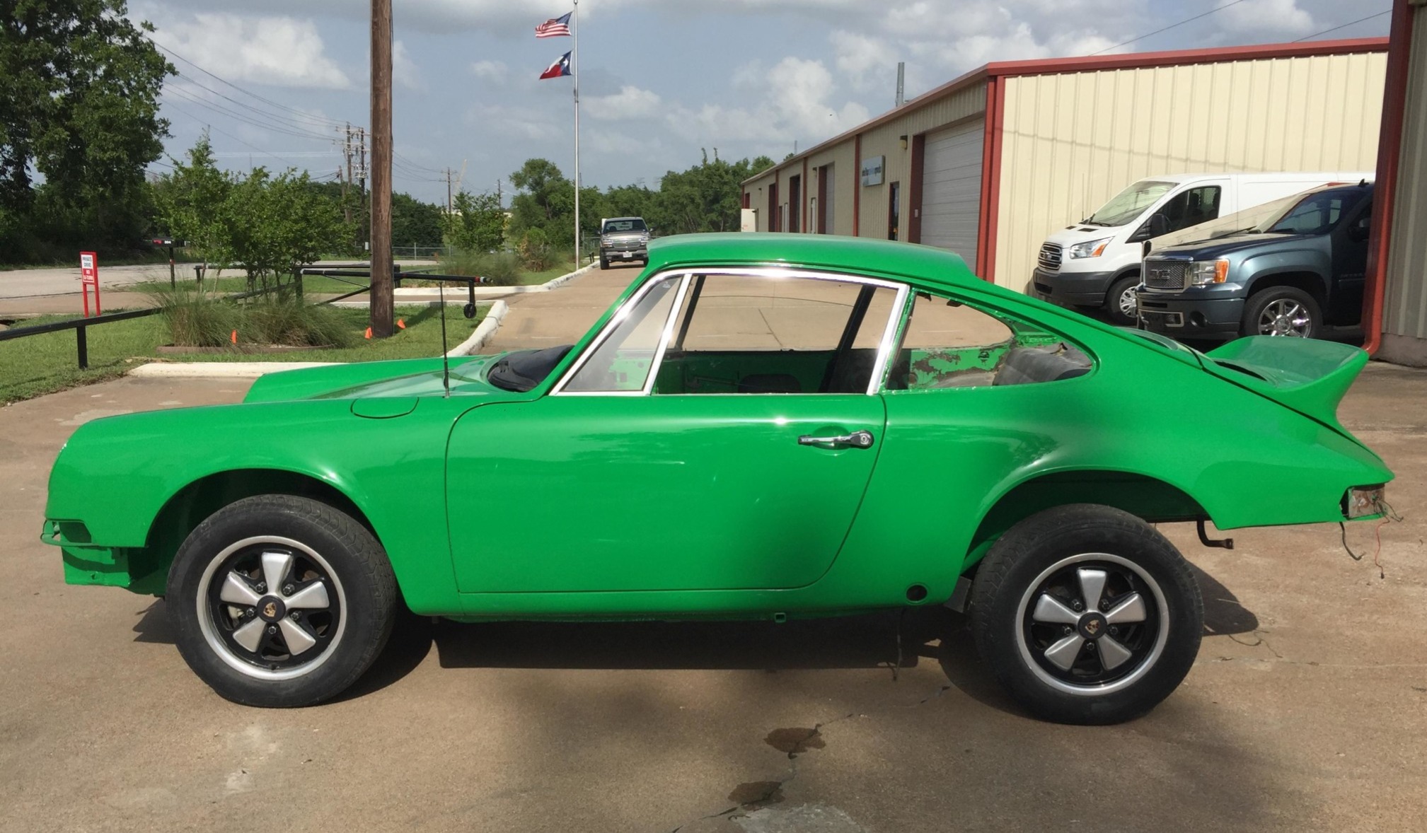 The passenger-side window and both front quarter windows are installed, while the remaining glass is said to be included in the sale. The car rolls on black Fuchs wheels with polished centers.