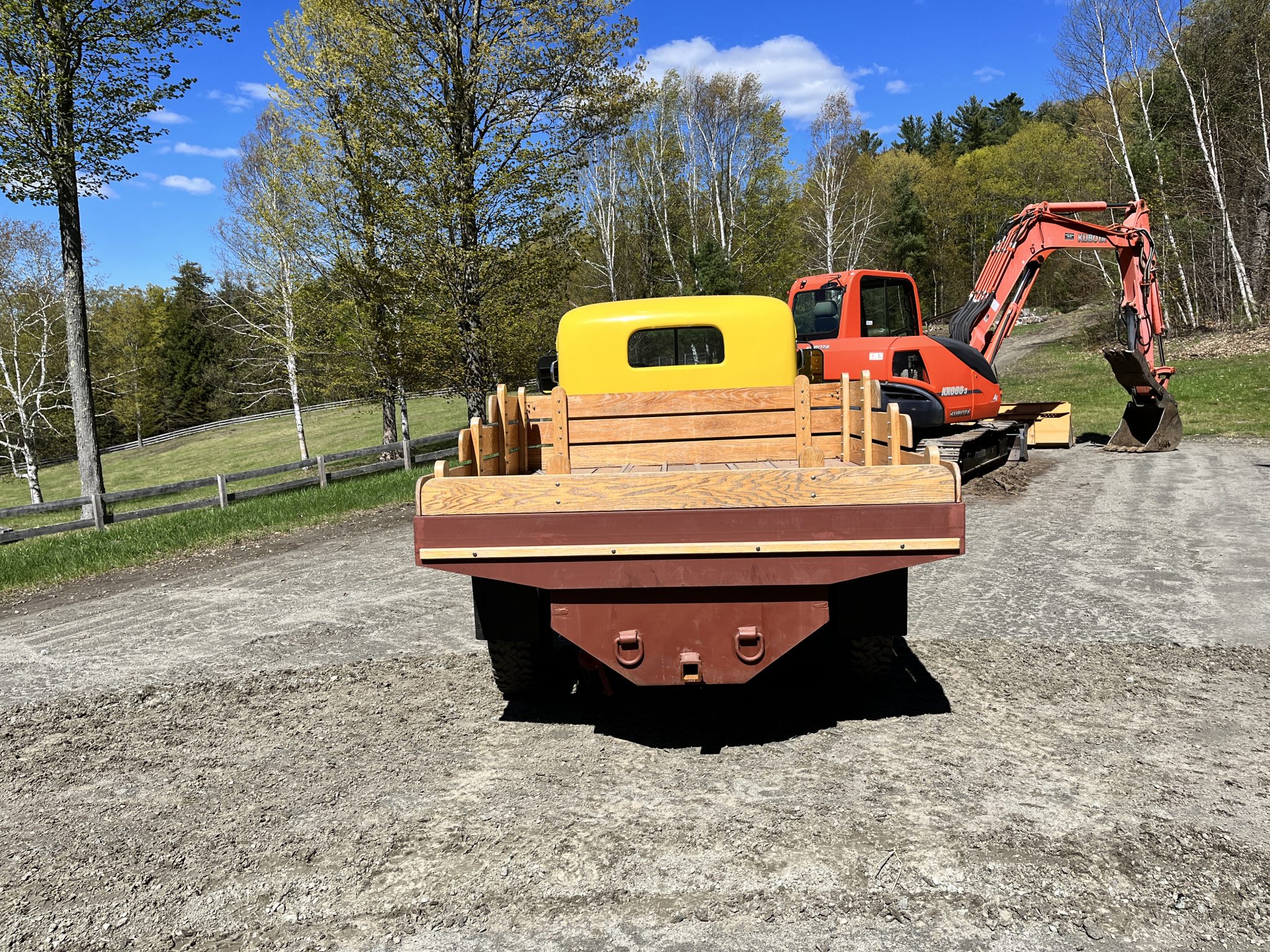 Black-finished 16″ steel wheels are mounted with 7.50–16LT tube-type tires that exhibit cracks. The fuel filler is accessible via a hinged opening in the bed floor. The brake master cylinder was replaced in 2023.