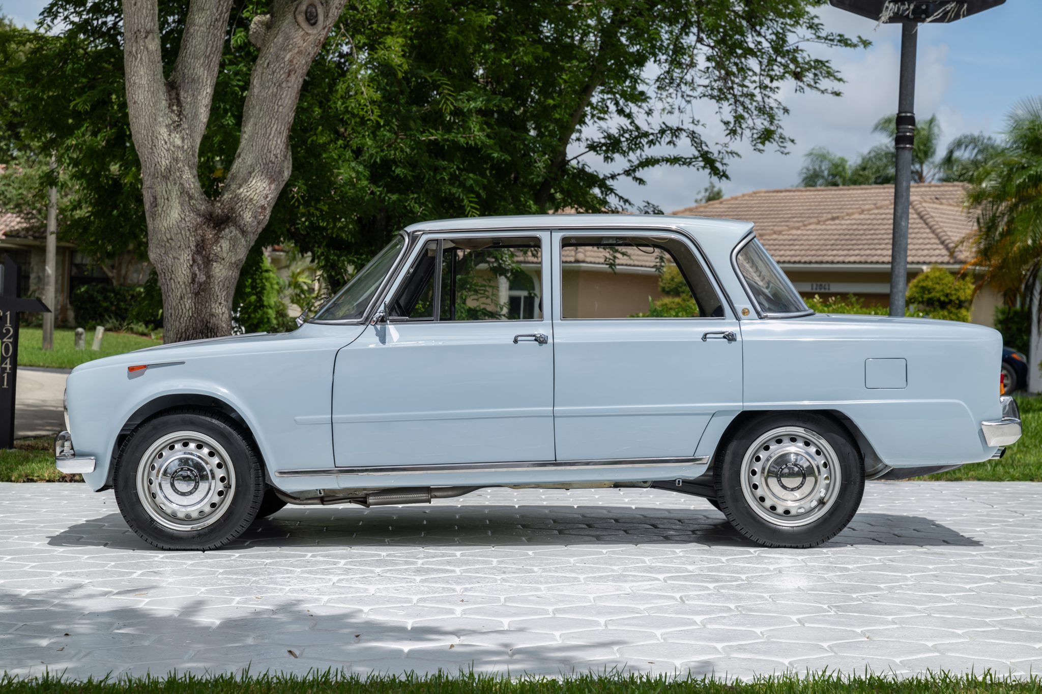 Silver-finished 15” steel wheels wear polished hubcaps and are mounted with 155-series Pirelli Cinturato tires. Braking is handled by four-wheel discs.