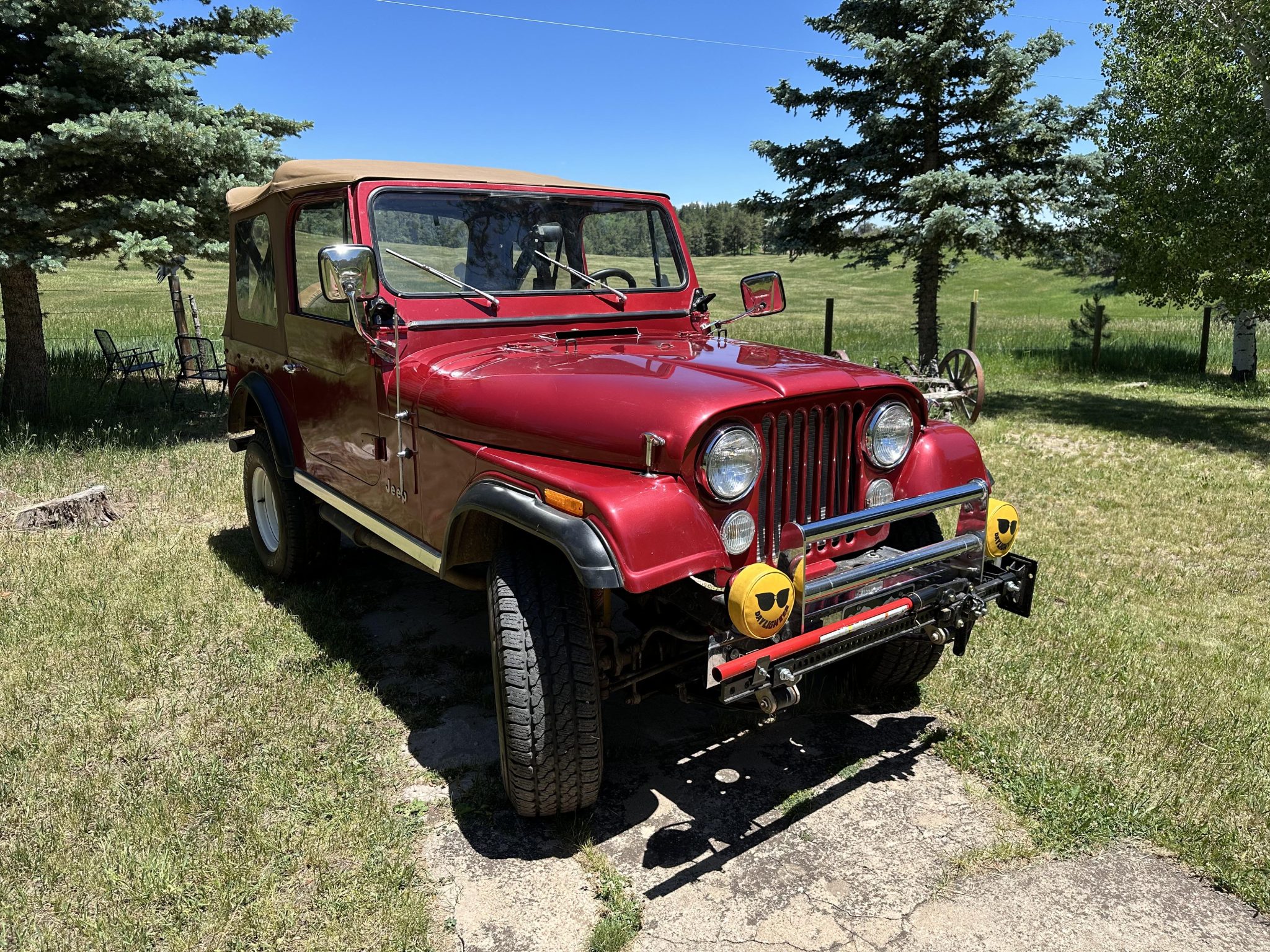 White-finished 15″ steel wheels are mounted with 31×10.5″ Cooper Discoverer A/T tires, and a covered spare is stowed on the rear carrier. The front axle is equipped with Warn manually locking hubs, and Old Man Emu heavy-duty leaf springs and shock absorbers have been retrofitted in addition to Hyperflex bushings. Braking is provided by front discs and rear drums.