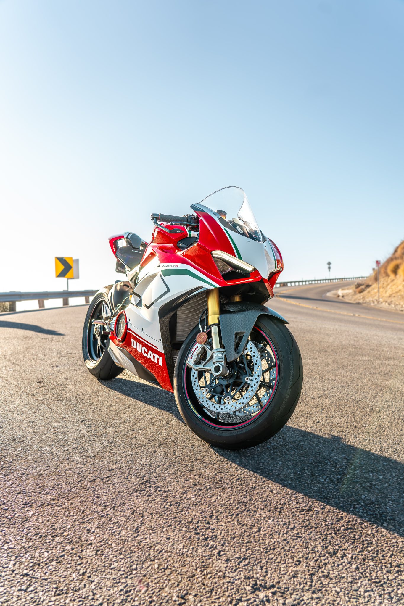Marchesini Racing 17″ split tri-spoke forged alloy wheels are finished in black and wrapped in Pirelli Diablo Supercorsa SP tires. Braking is provided by Brembo Monobloc Stylema calipers mounted over dual 330mm semi-floating discs up front as well as a Brembo caliper and a 245mm disc at the rear, and the bike is equipped with Bosch Cornering ABS EVO. The seller notes the brake fluid was flushed.