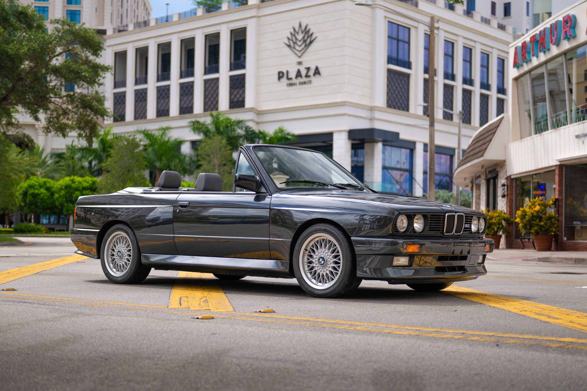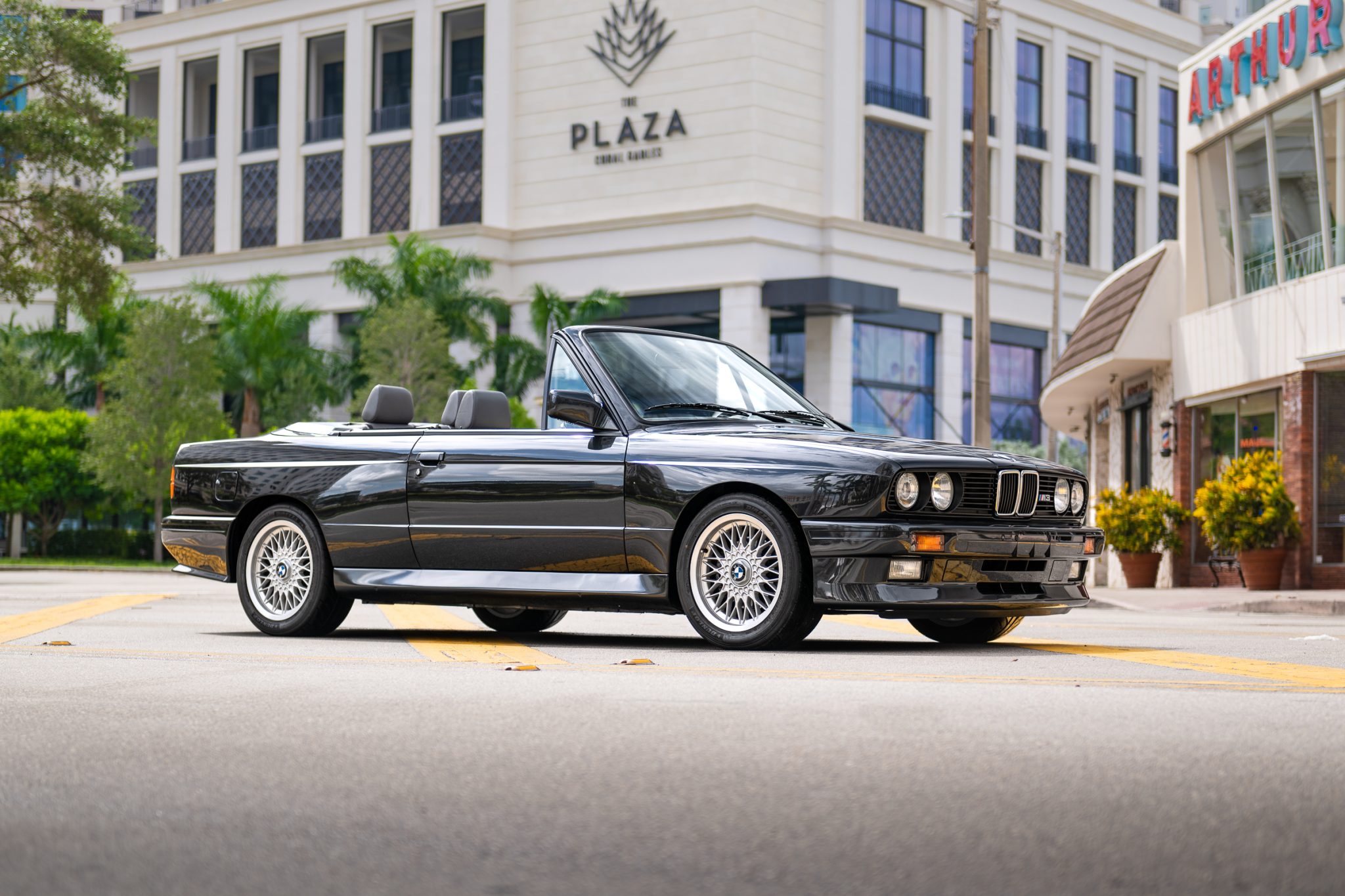 The car is finished in Diamantschwarz Metallic and was optioned with an automatic antenna and adjustable headlight leveling. The convertible top is power-operated and the seller notes that the top fabric was replaced in 2016.
