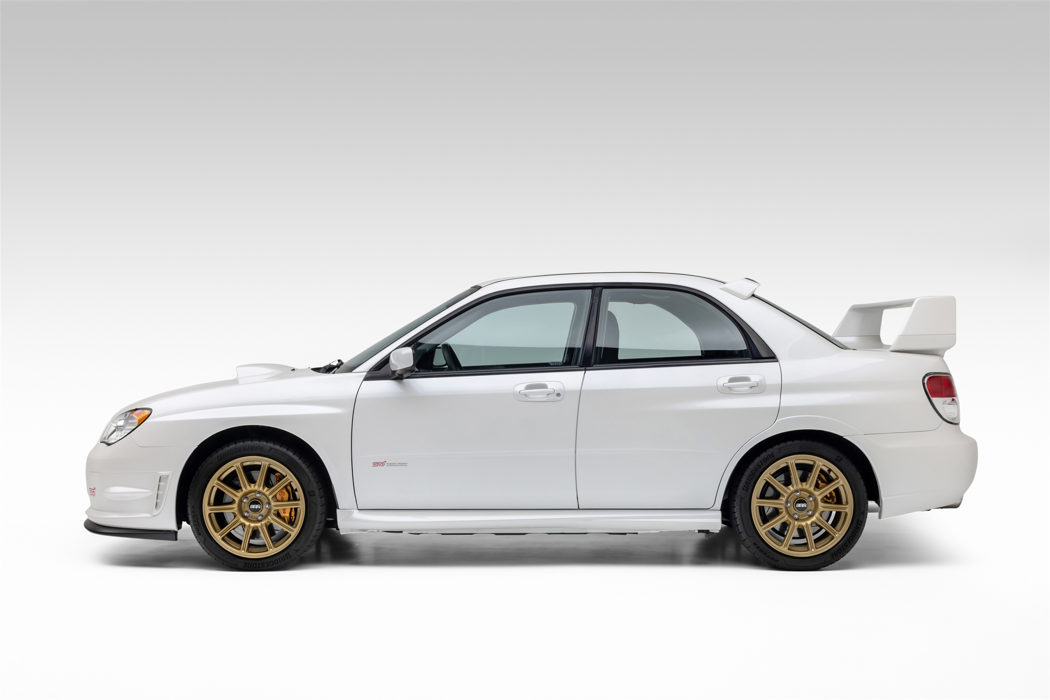 Gold-finished 17″ 10-spoke BBS alloy wheels wear Bridgestone Potenza Sport tires that were reportedly mounted in 2023. Stopping power is provided by four-wheel disc brakes with Brembo four-piston front and two-piston rear calipers. The seller notes StopTech brake rotors and braided lines have been installed.