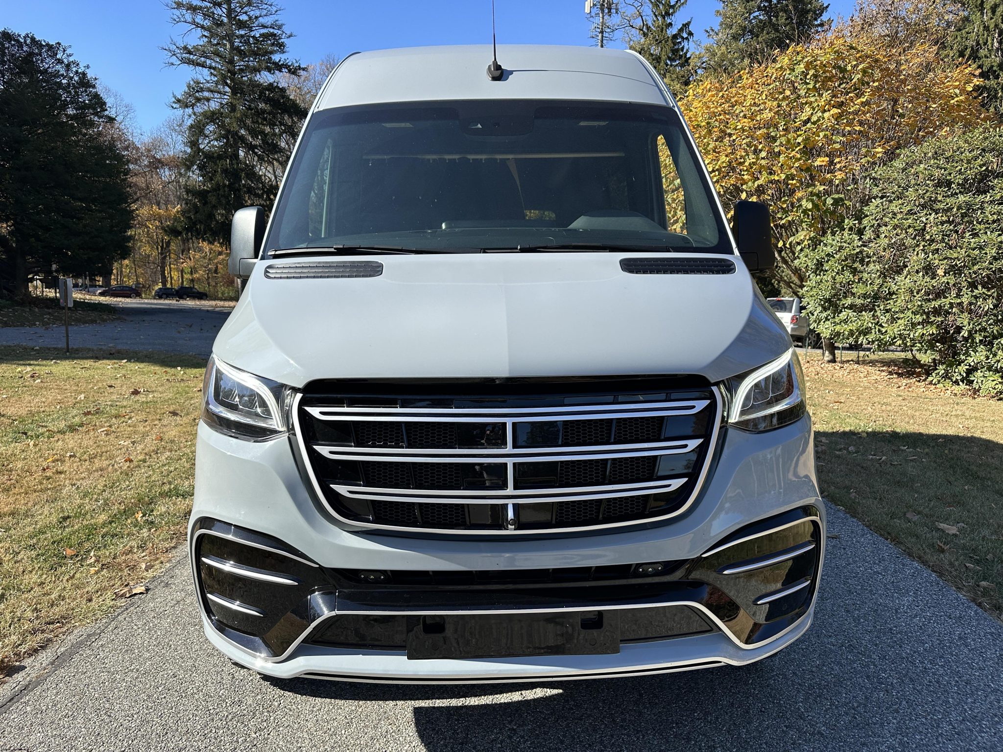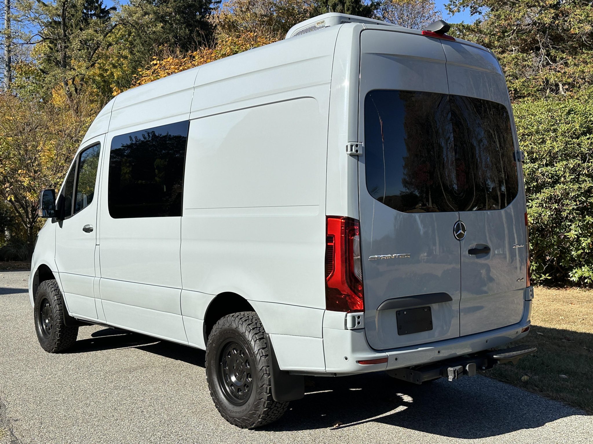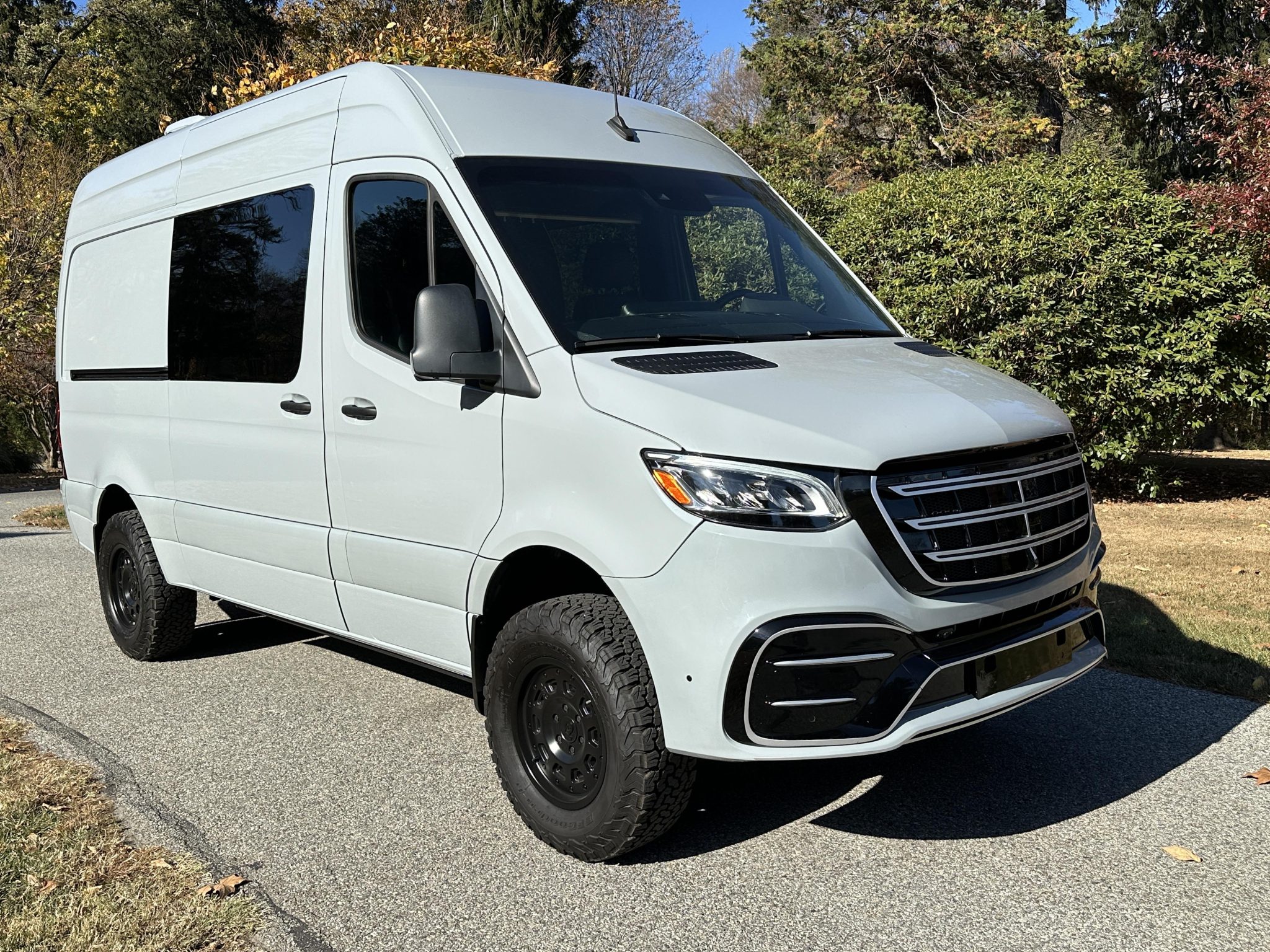 The black-finished Owl 17″ alloy wheels are mounted with 265/70 BFGoodrich all-terrain tires. The van rides on air-adjustable rear suspension and a solid rear axle, and braking is handled by discs at all four corners. The chassis is equipped with an Electronic Stability Program (ESP).