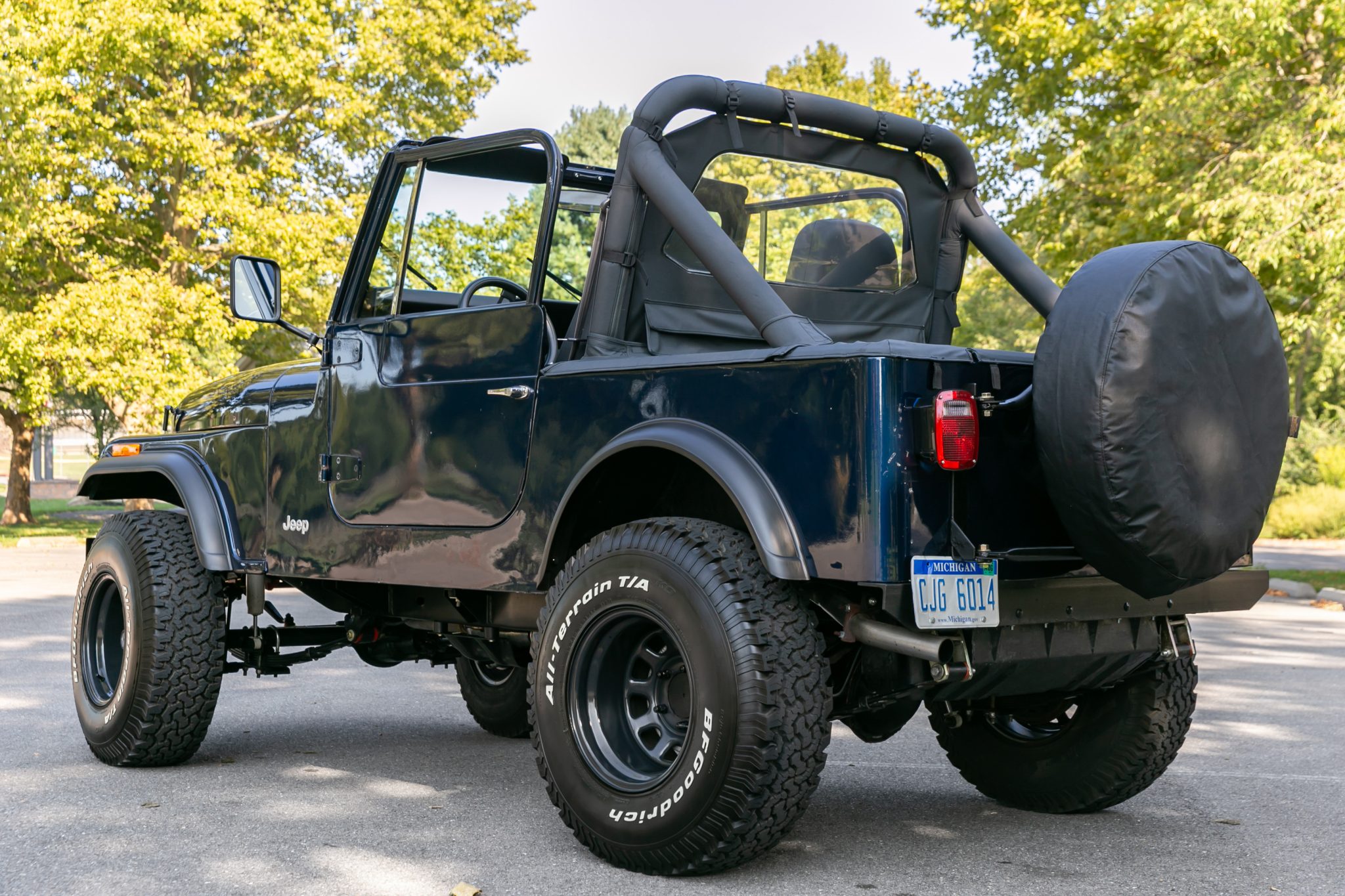 Black 15″ steel wheels are mounted with 33×10.5″ BFGoodrich All-Terrain KO tires, and a covered spare is affixed to the swing-away tire carrier. The Jeep is equipped with manually locking front hubs, power steering, a 4″ Rough Country suspension lift, and polyurethane suspension bushings. Work completed under current ownership involved replacing the steering box, steering shaft, and power steering pump in addition to the wheel cylinders, brake master cylinder, brake lines, and the front and rear brake pads, drums, and rotors.