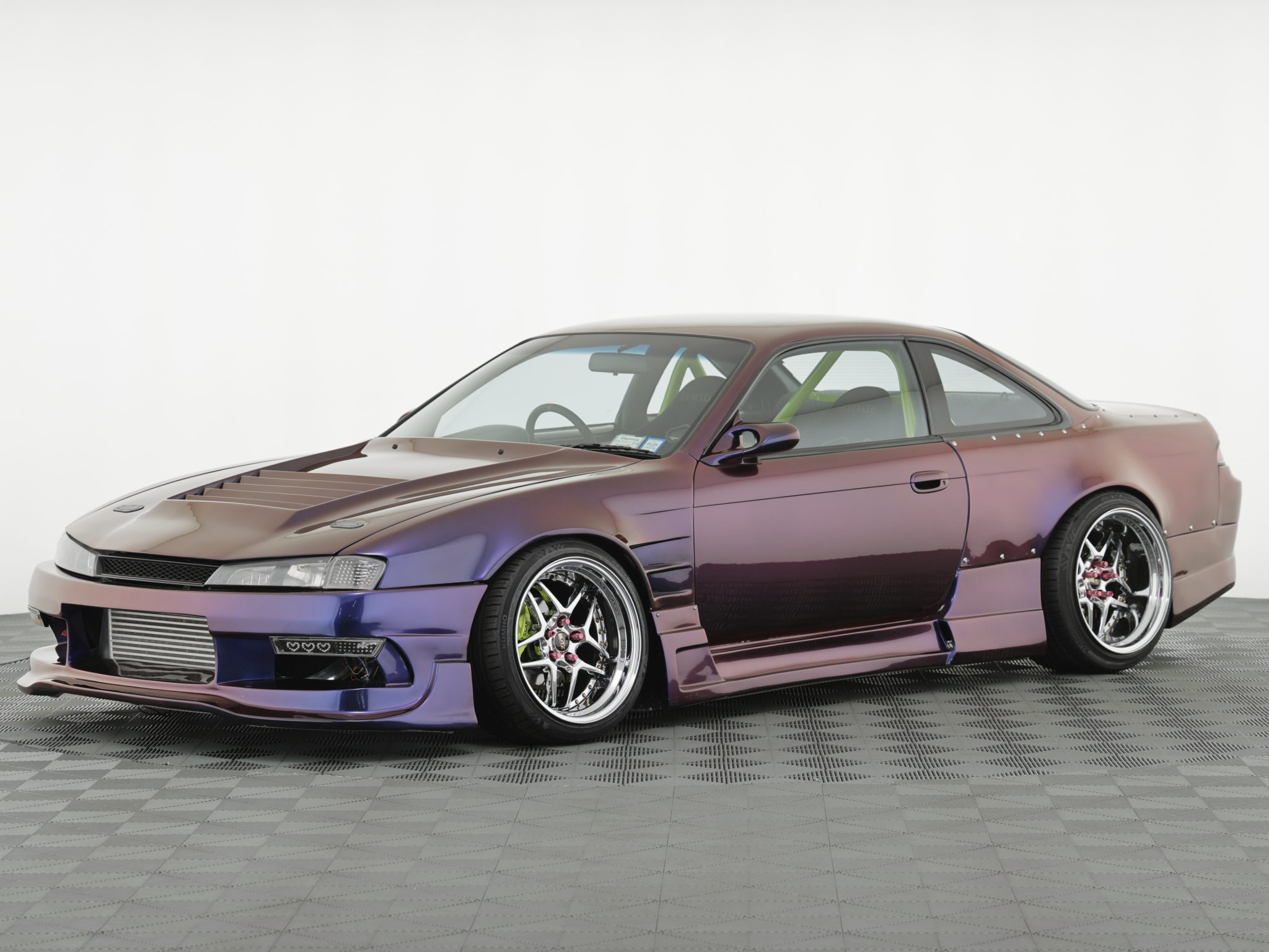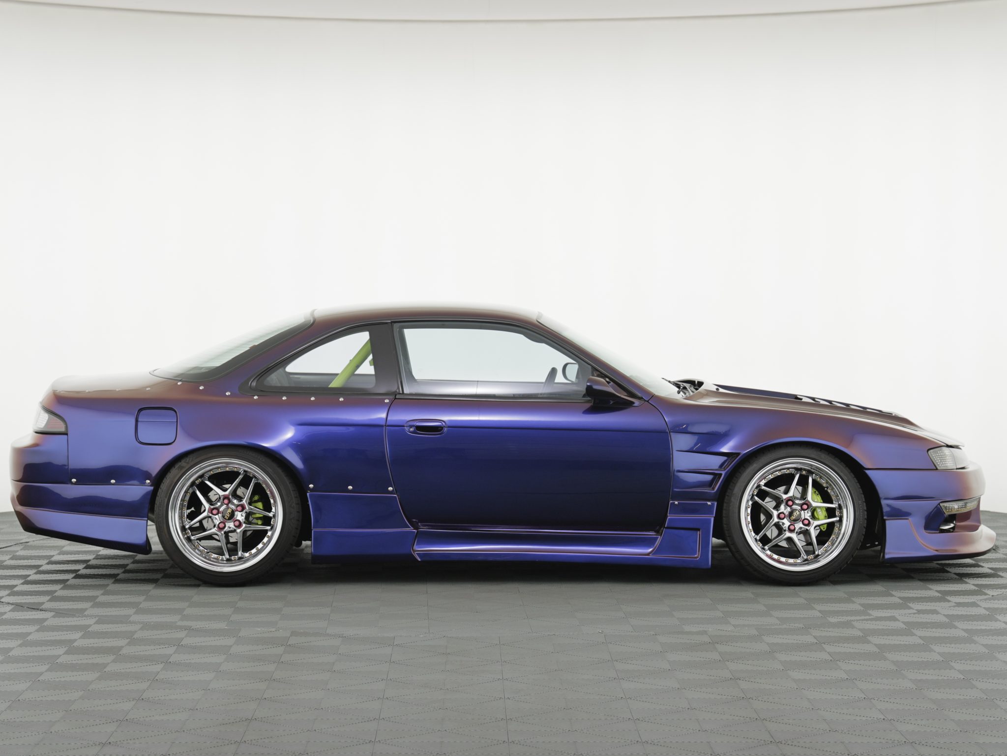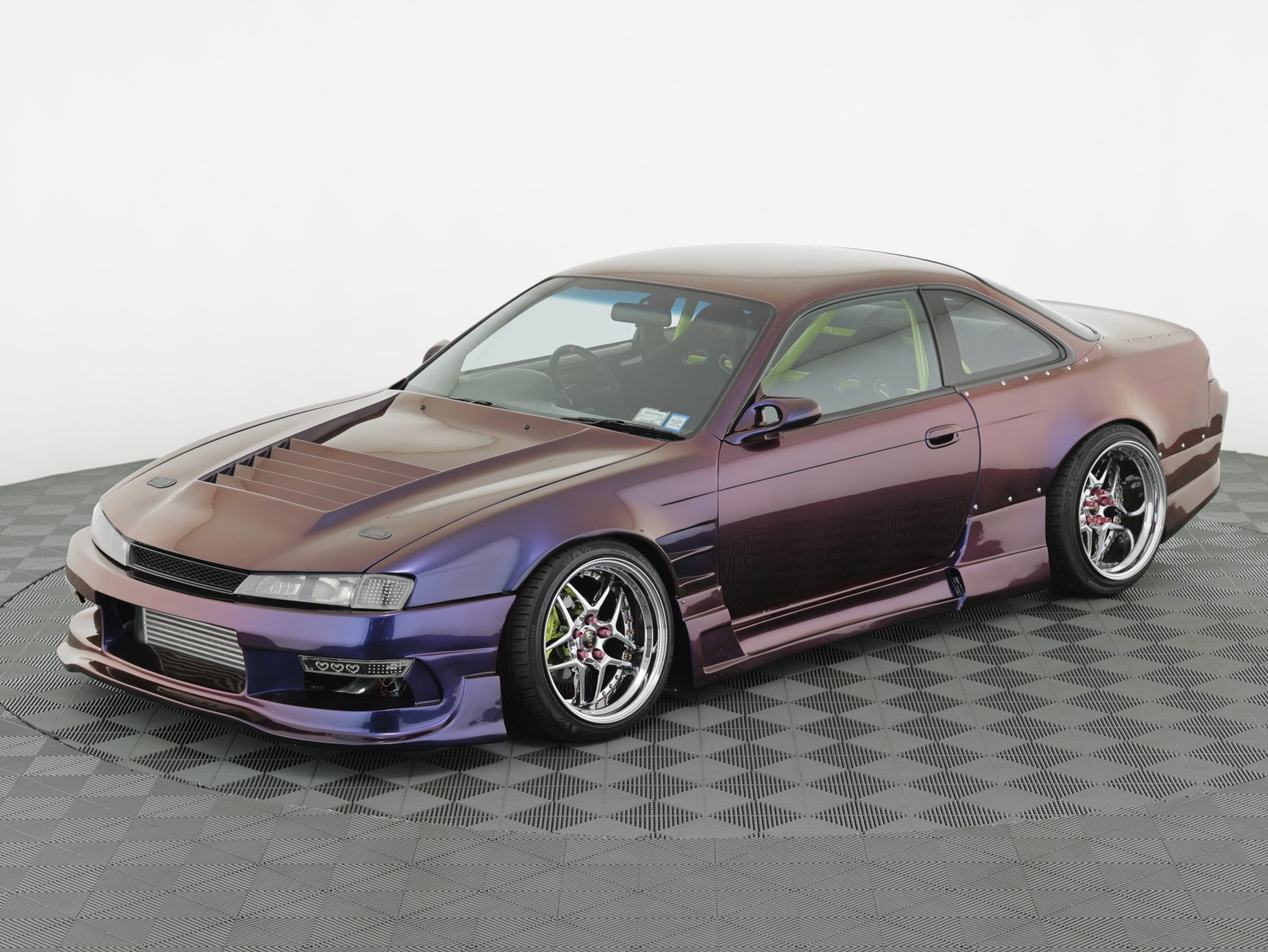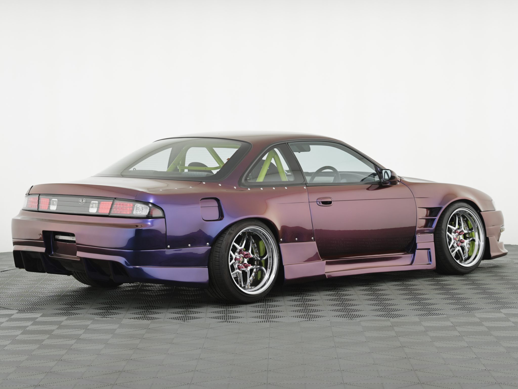 Blitz 03 18” wheels are mounted with 255/35 front and 275/35 rear Kumho Ecsta PS31 tires. An Airtekk Stage 2+ air suspension system has been installed, and stopping power is provided by disc brakes with slotted rotors and green-finished calipers at all four corners.