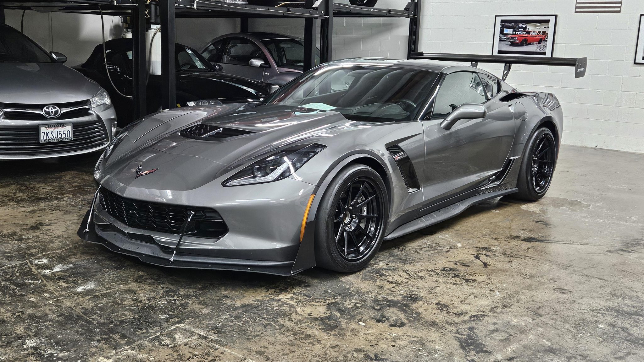 Black-finished RaceTech Forged wheels measuring 18″ up front and 19″ out back are mounted with Hoosier R7 competition tires. The suspension is modified with DSC Sport RT magnetic dampers joined by a DSC controller module. Stopping power is provided by an AP Racing Pro 5000 front big brake kit and a factory rear setup, both of which are loaded with high-performance pads. Black-finished factory wheels mounted with used Michelin Pilot Sport Cup 2 tires are included in the sale. Factory wheels mounted with worn Michelin Pilot Sport Cup 2 tires are included in the sale.