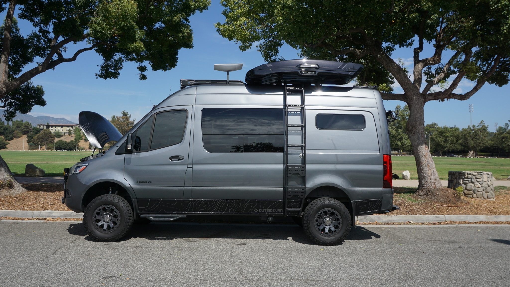 The 17″ Black Rhino wheels are mounted with 265/70 BFGoodrich All-Terrain Ko2 tires. The van rides on independent front suspension and a solid rear axle, and braking is handled by discs at all four corners. The suspension has been lifted with Agile front coilovers and Agile-tuned Bilstein rear shocks.